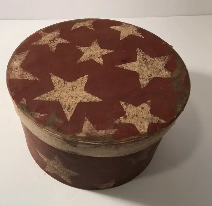 Great patriotic primitive salt box. Has some wear but may have been made to look worn on edges. Paper mache stain and paint by Gainer Creek Crafts