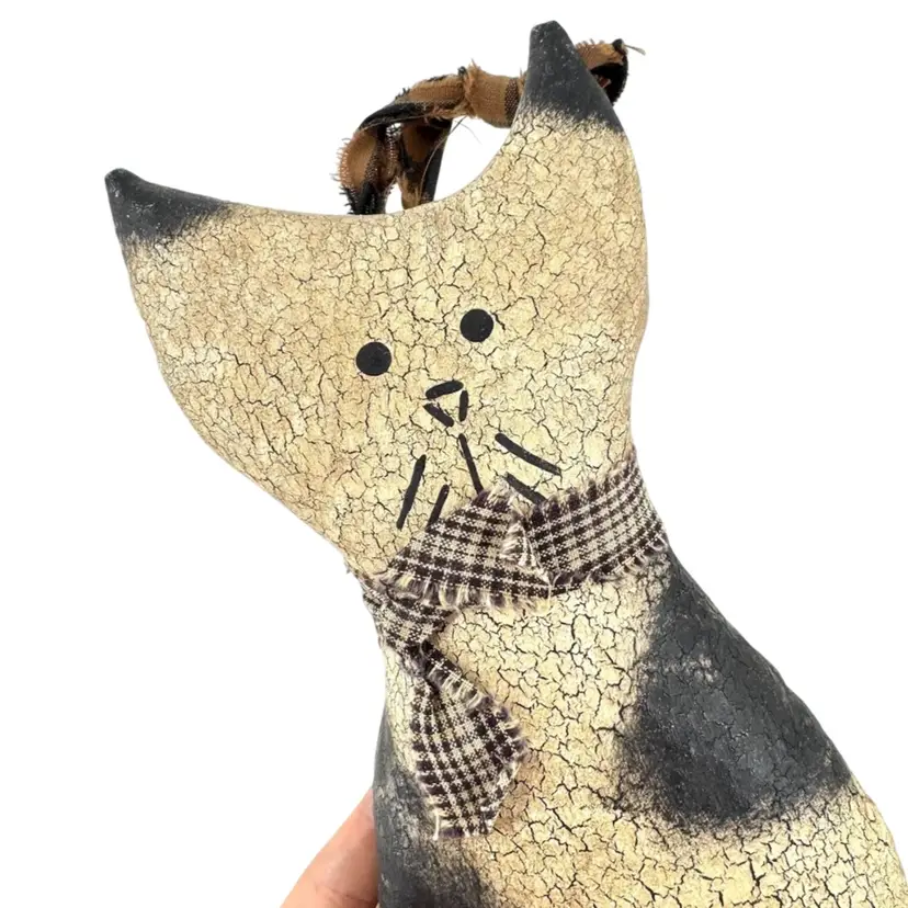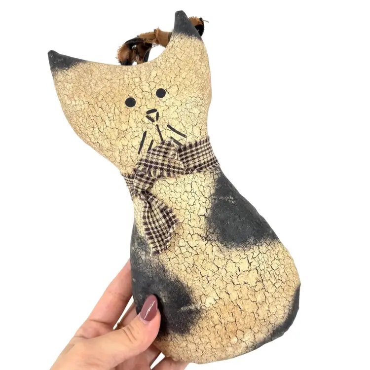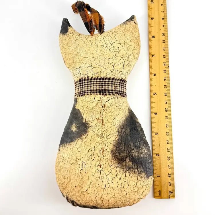 This Primitive Starched Cat is approximately 9” in height. There are no holes or rips anywhere on the starch. It is also has no signatures or markings on it. It Appears to be handmade.