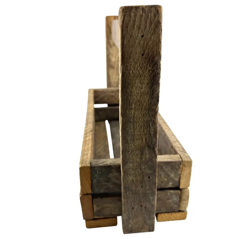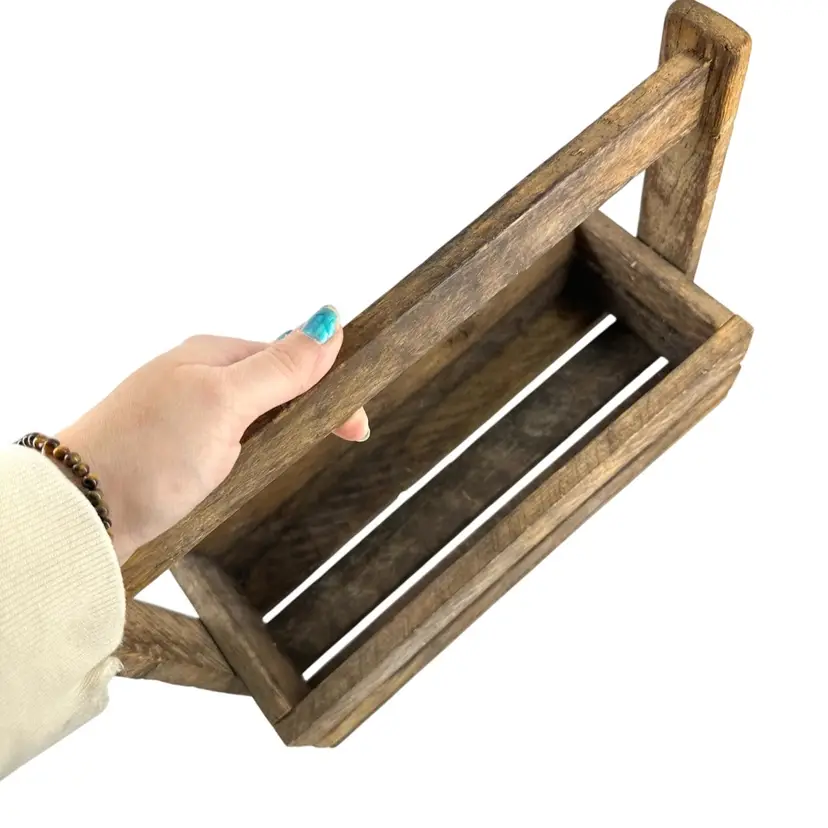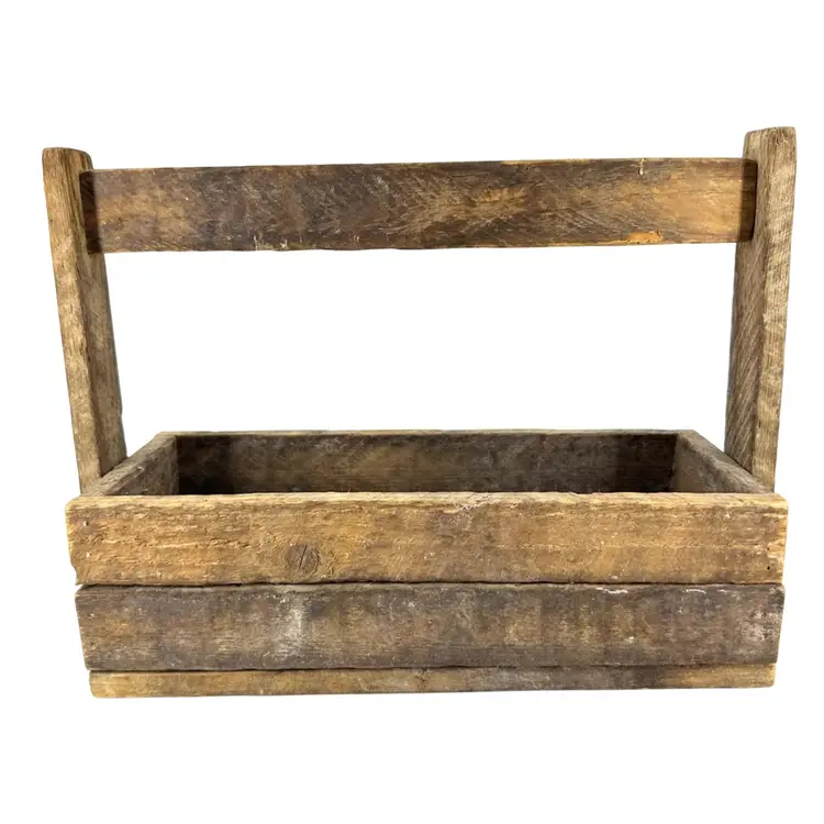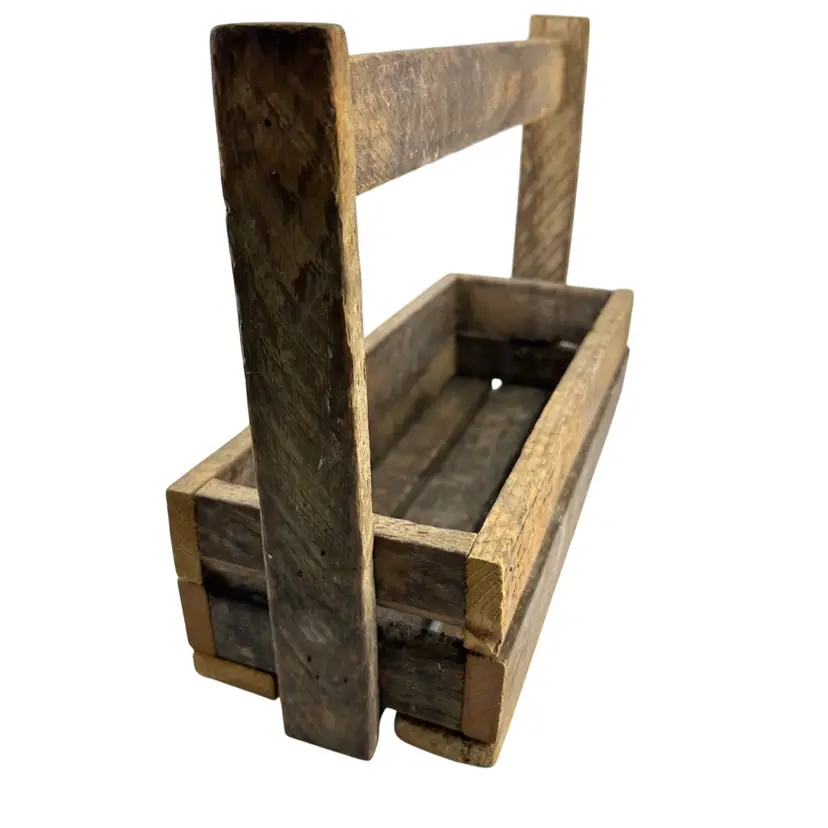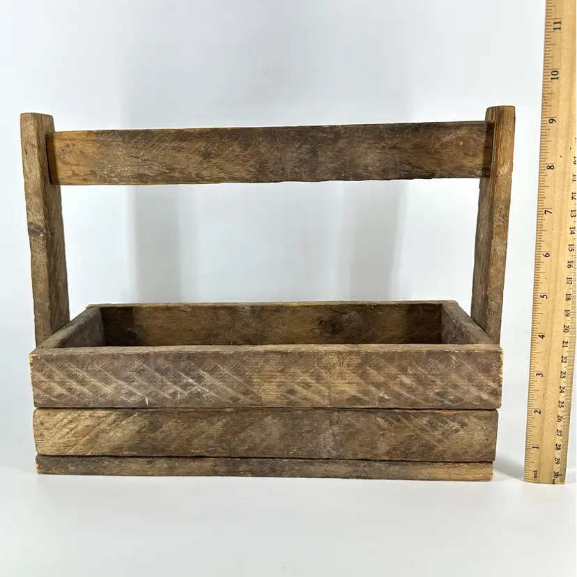 This Primitive Wooden Tool Caddy measures approximately 9.5” in height, 13” in length. There are no chips or cracks, does have some chips, dings, and tiny scratches in the wood due to age. All can be seen in the photos. There are also no signatures or markings anywhere.
