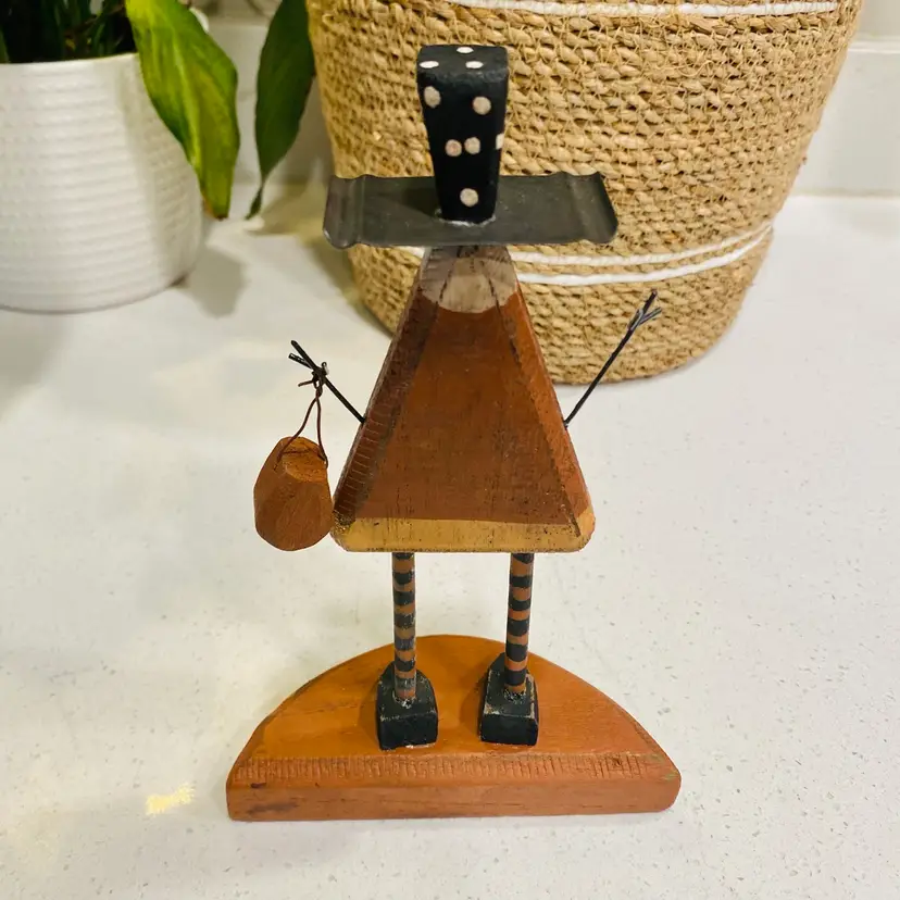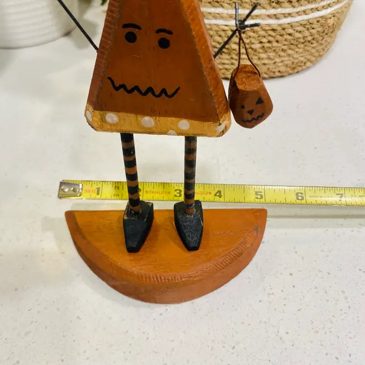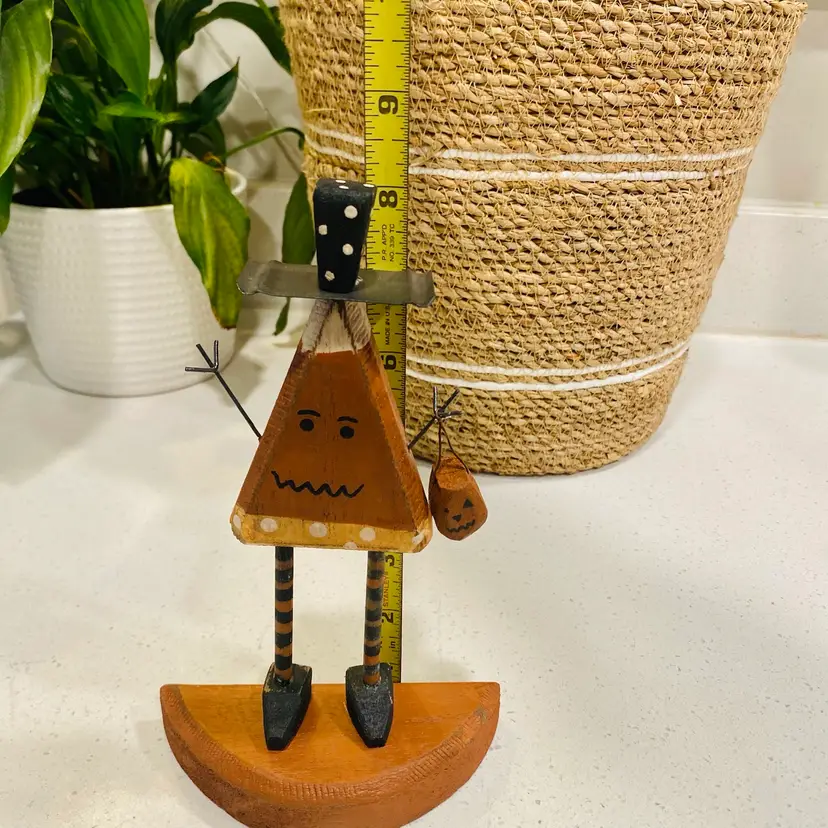 The Primitives By Kathy Halloween Wooden Candy Corn Statue is a small 8" figurine made of wood in a vibrant orange color. With a quirky Halloween theme and folk art style, this statue is a perfect addition to any room during the Halloween season. Made in the United States by Primitives By Kathy, this unique piece adds a touch of whimsy to your holiday décor.