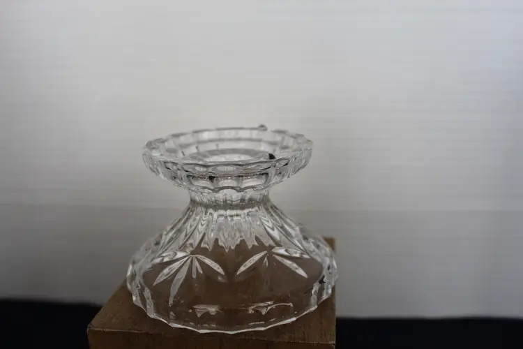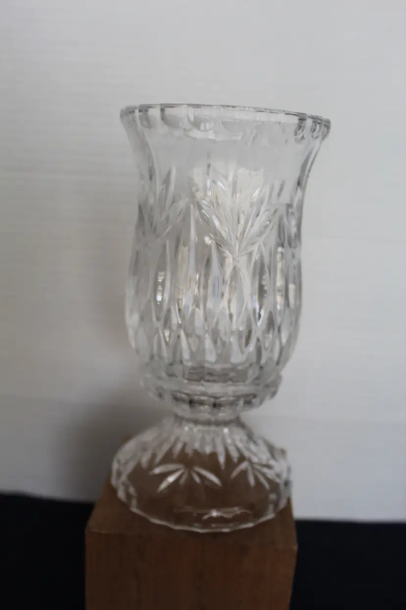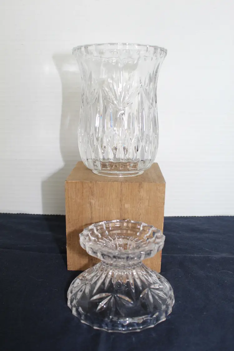 The Princess House Highlights 2-Piece Lead Crystal Hurricane Candle Lamp #870 is a medium-sized, round candle holder suitable for all occasions. Made of clear crystal with a shiny finish, it features a scalloped pattern and textured design. This traditional style candle lamp is from the late 20th century and is not handmade. With a setting closure type, this candle holder is perfect for any room and can hold taper candles, votive candles, or mini candles. It is a collectible item that adds a touch of elegance to any space.