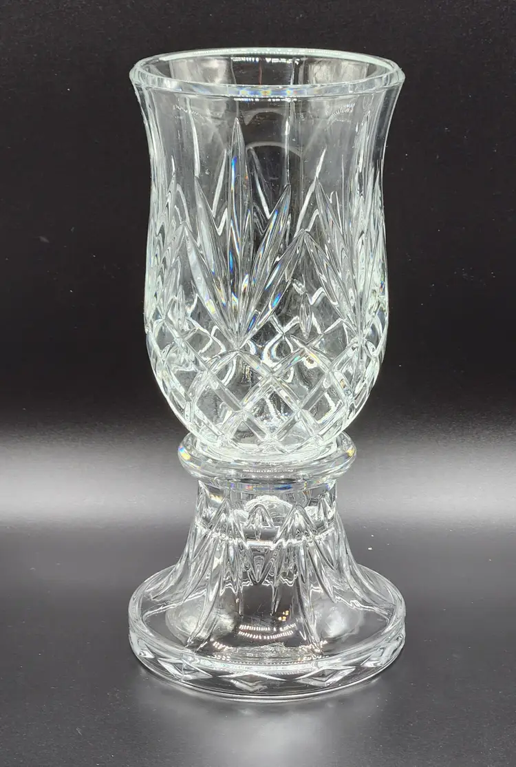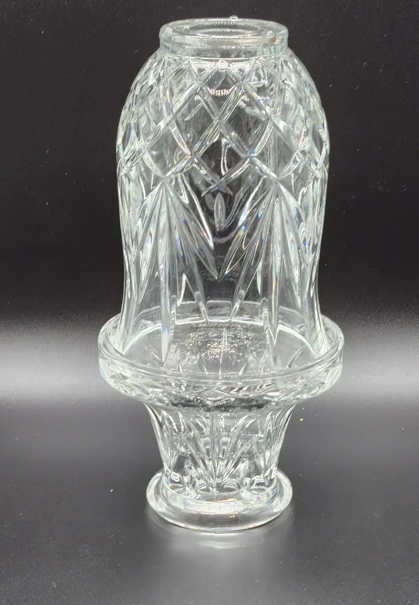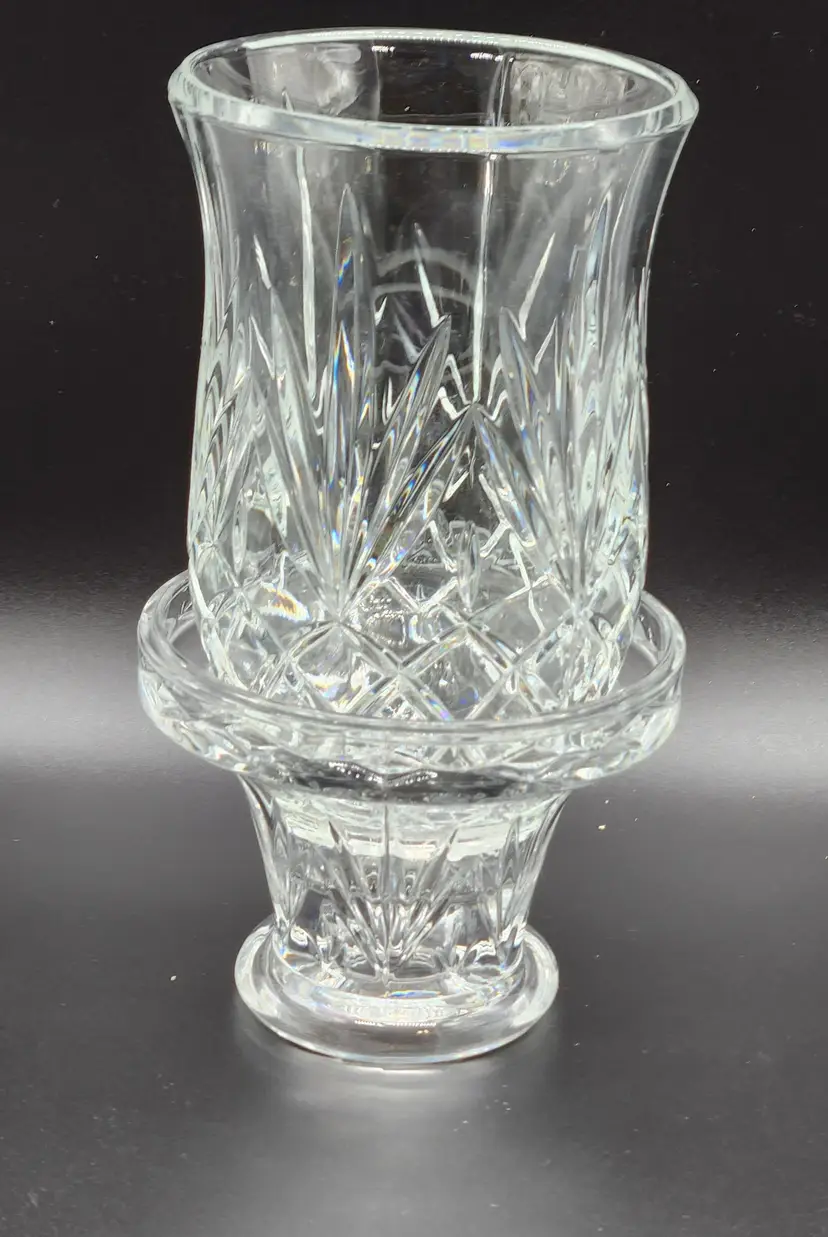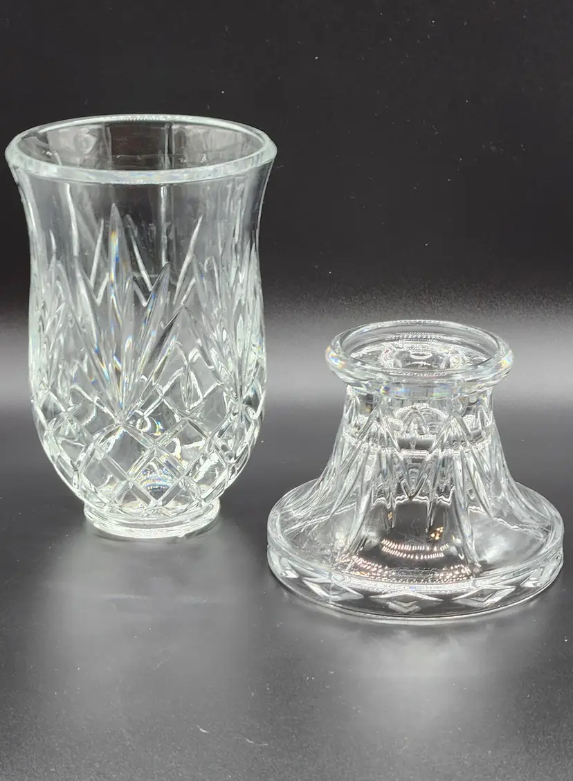 Beautiful crystal 2 pc hurricane lamp candle holder from Princess House. Can be used 3 ways as shown in pictures with both pillars and tapers. The base is 5" diameter and 4" tall and can be used a s taper holder The chimney is 6 1/4" tall and has a top diameter of 4 1/2". Intital it stands anout 10.25"tall. It is heavy weighing in at 3lbs 11oz In like new condition without any chips or cracks or wax residue