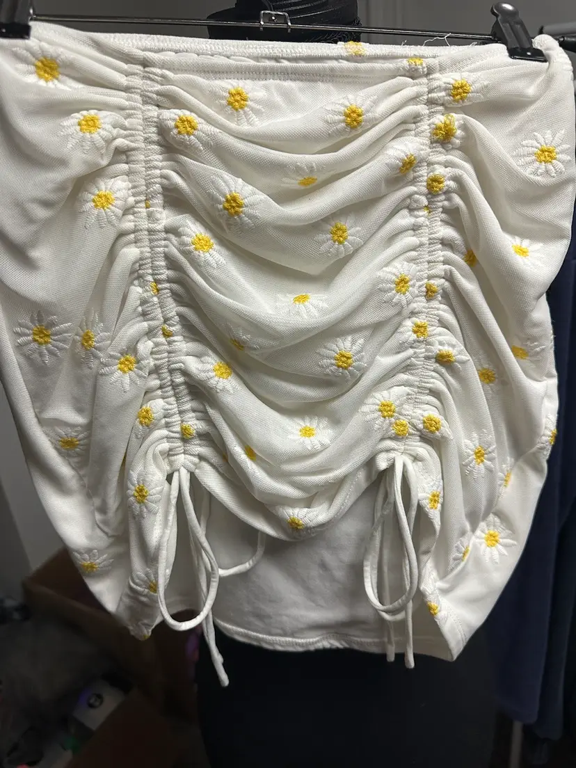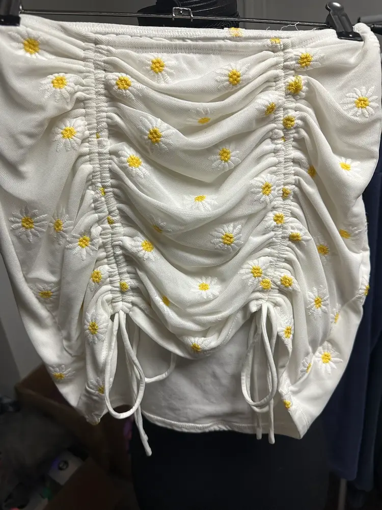 Size:4 Smoke free environment Sold out! No longer available online! Mint condition, no call outs! High waisted Twin adjustable ruching in front Mesh material over lay Elastic waist Fully lined Slim fitting I’m pretty sure this is NWOT