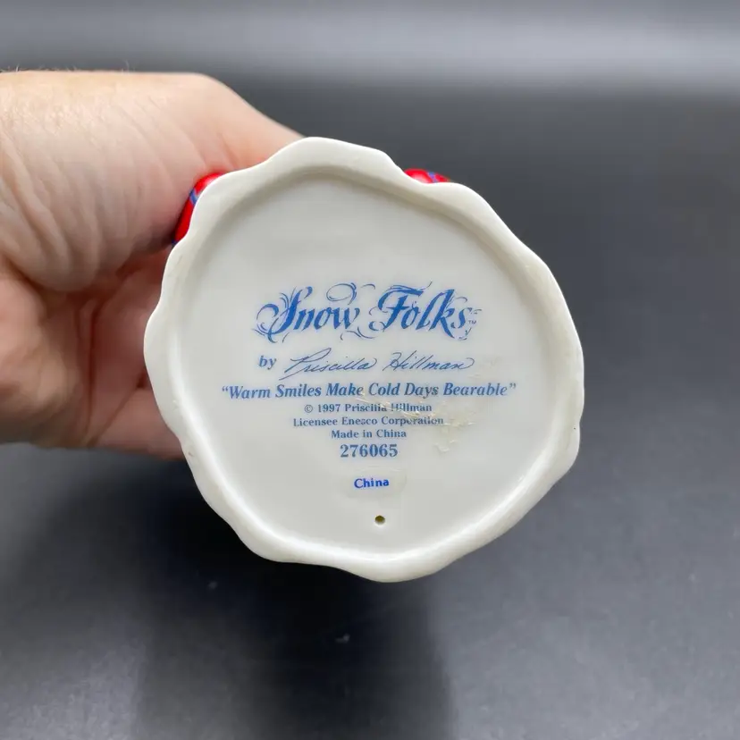 This is a vintage 1997 Enesco Snow Folks porcelain snowman figurine #276065. Titled Warm Smiles Make Cold Days Bearable. Designed and signed by Priscilla Hillman. Measures approximately 4.5” tall. No box. No chips or cracks.