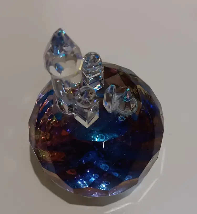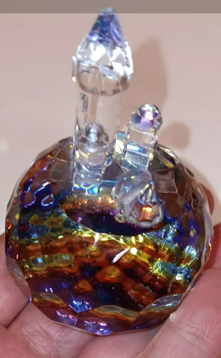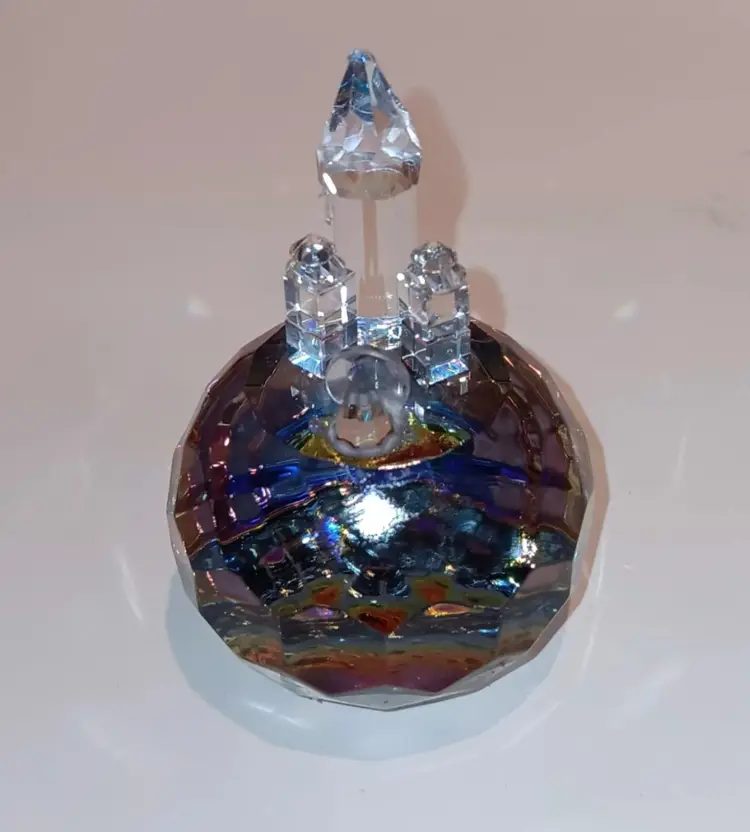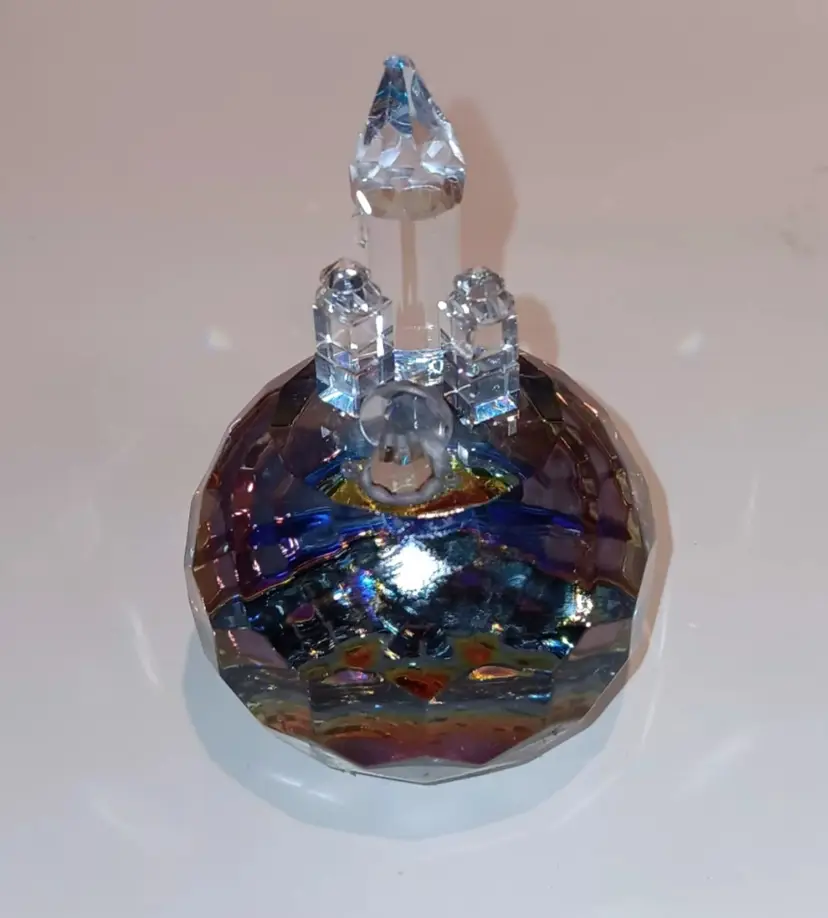 Beautiful rainbow color on this prism Paperweight. Does have a chip on top of tallest building. Measuring 3" tall and 2" wide.