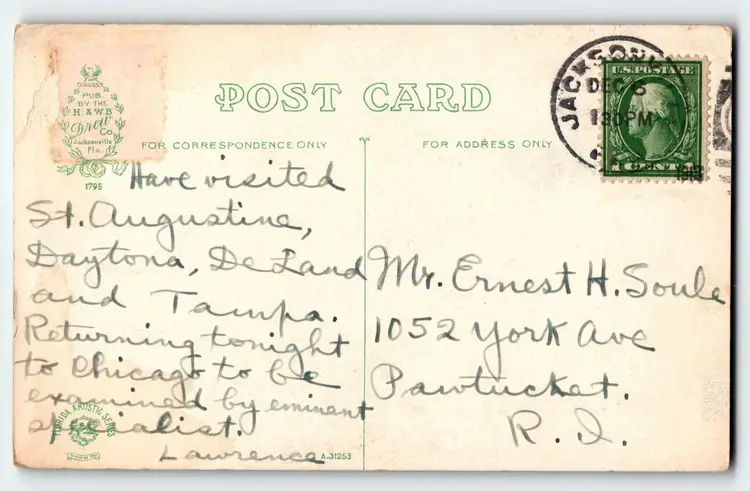 Number of Items in Set: 1 Unit of Sale: Single Unit Artist: Unknown Occasion: Sayings & Quotes Size: Standard (5.5 x 3.5 in) Signed: No Custom Bundle: No Year Manufactured: 1910 Material: Paper City: Unknown Original/Licensed Reprint: Original Franchise: Does Not Apply Brand/Publisher: H & WB Drew Subject: People Continent: North America Type: Printed (Lithograph) Era: Divided Back (1907-1915) Region: Florida Country: United States Theme: Cities & Towns, Greetings, Social History, Tourism, Palm Trees, Victorian, Private Home Features: Divided Back Time Period Manufactured: 1900-1919 Country/Region of Manufacture: United States Postage Condition: Posted