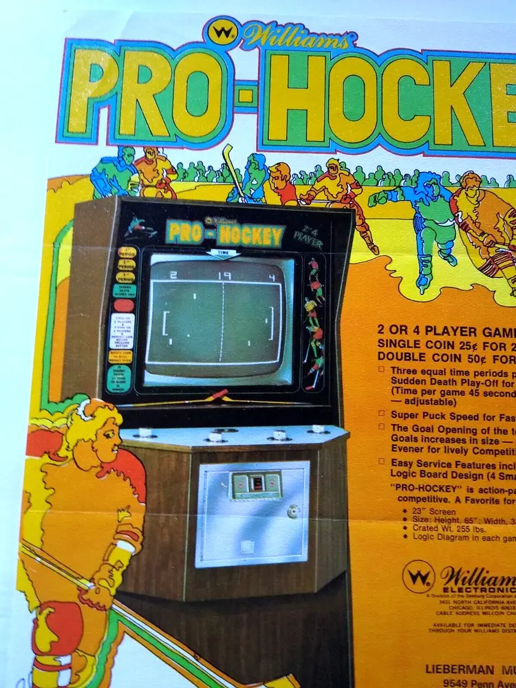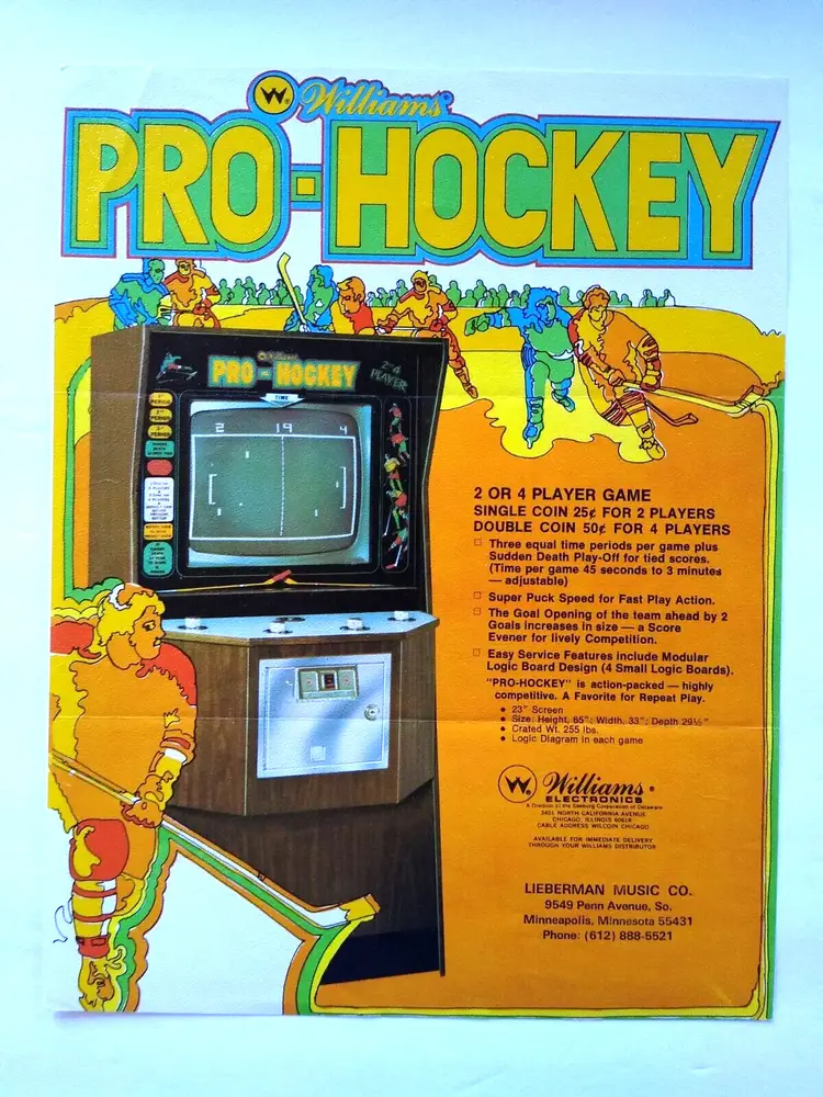 Brand: Williams Year: 1973 Game Title: Pro-Hockey Original/Reproduction: Original Country/Region of Manufacture: United States Modified Item: No Arcade: Flyer