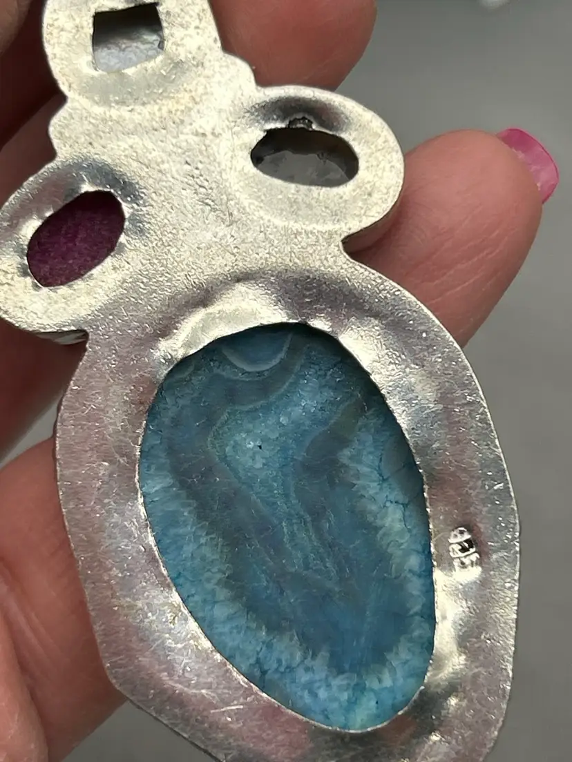 Details • Metal: Sterling silver (stamped 925) • Stones: Blue agate slice, ruby-red cabochon, mother of pearl • Length: Approximately 3 inches • Weight: 28 grams • Era: Contemporary artisan / modern handcrafted style • Condition: Very good vintage condition with light, age-appropriate wear