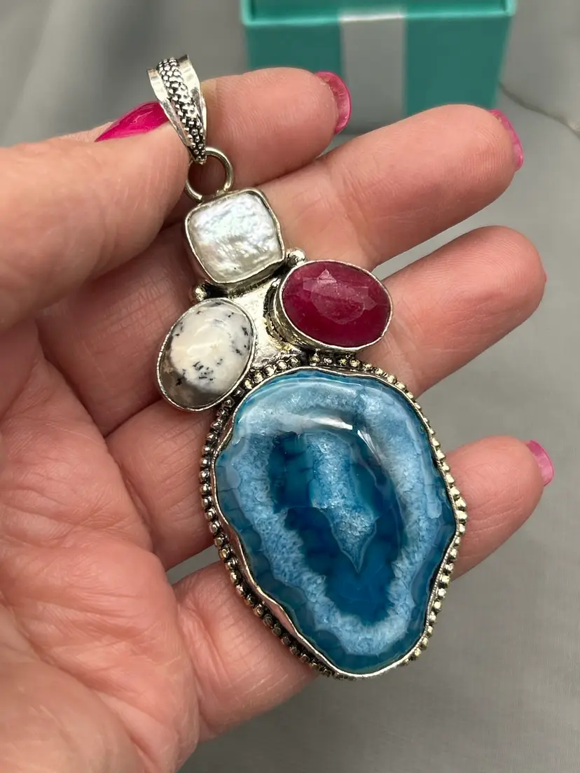 Crafted in sterling silver, this striking pendant features a layered arrangement of natural stones. The focal point is a vivid blue agate slice with organic banding and crystalline textures, accented by a rich ruby-red cabochon and luminous mother of pearl. The mixed-stone design creates depth, color contrast, and a one-of-a-kind, artisan feel.