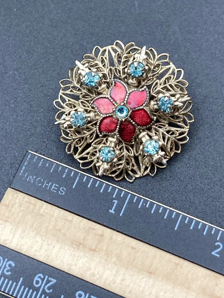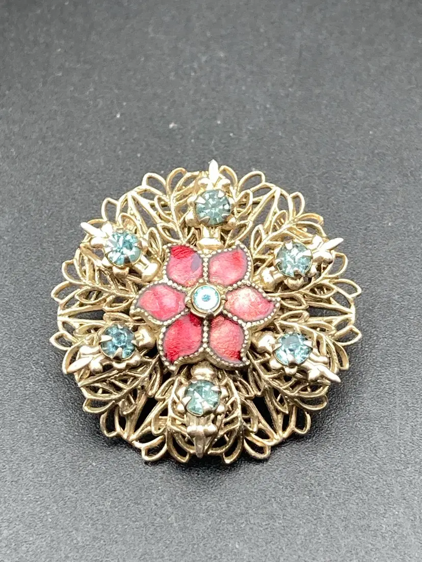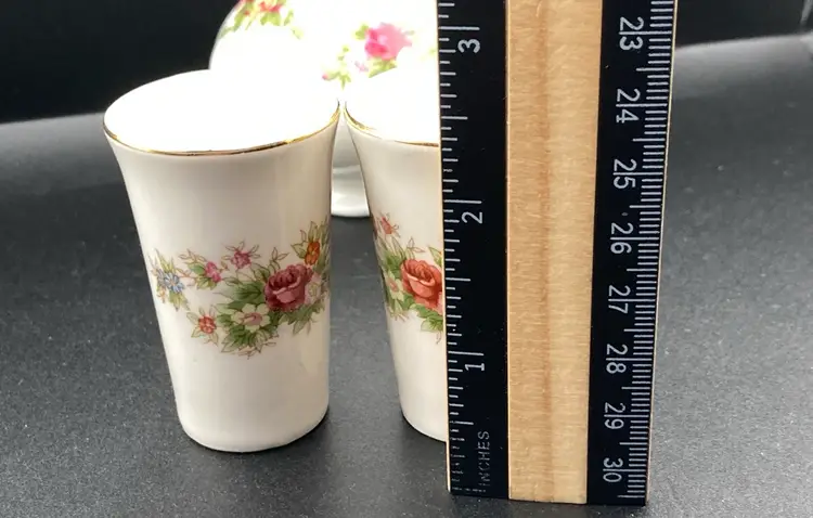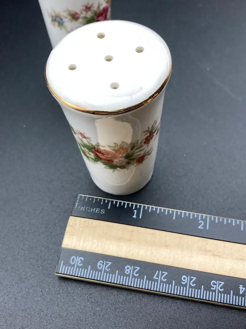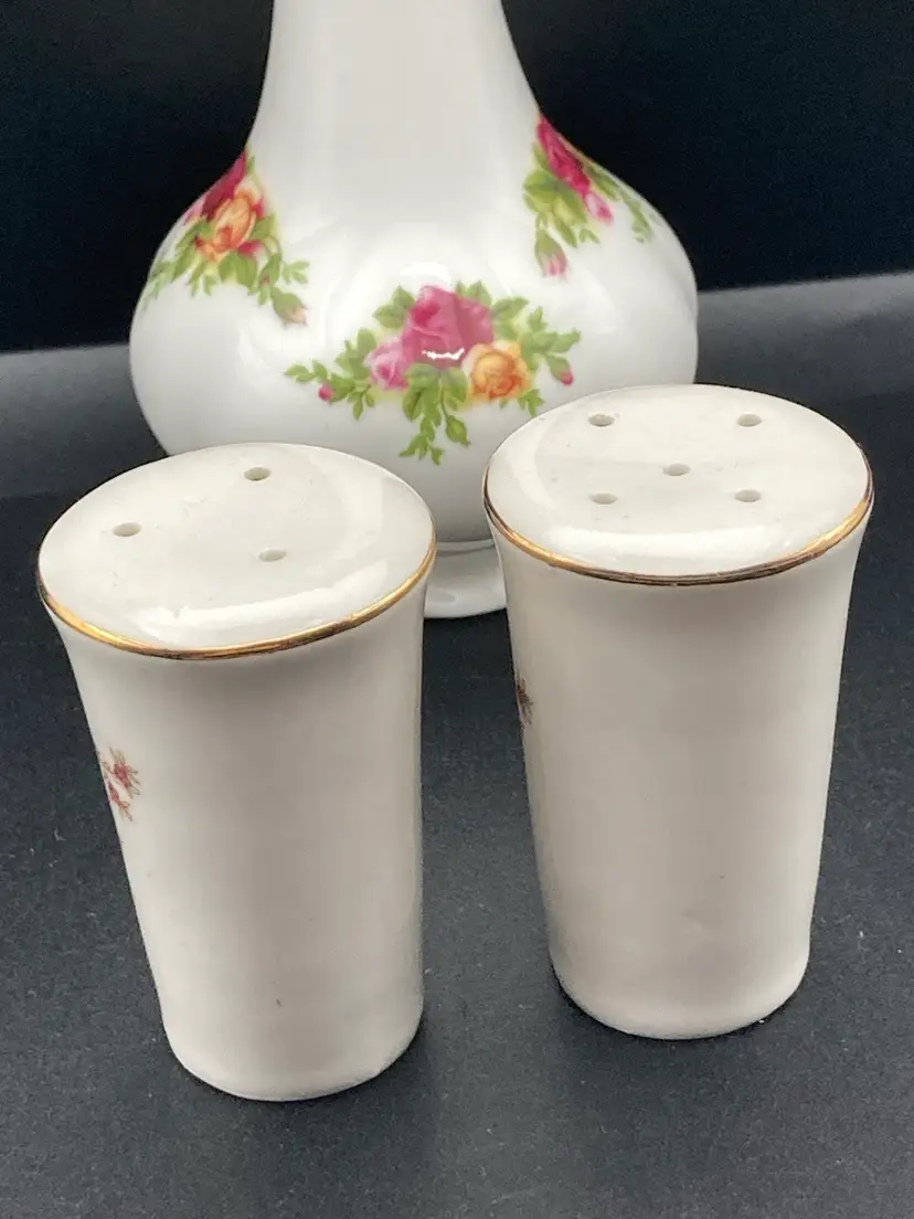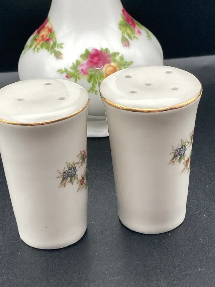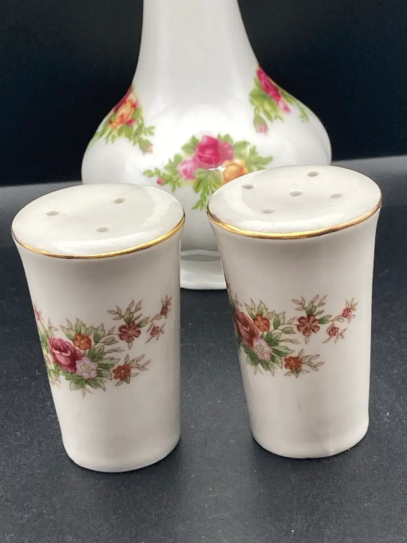 Promised Garden Vignette! Vintage Gold Tone Filigree Flower Brooch With Blue Rhinestones (1/4” Diameter) READ (Slight Bend To Pin On Back) Vintage 1962 Royal Albert Bone China Old Country Roses Vase Made In England (5 1/4” Tall 3” Wide READ Slight Wear To Gold Around Top As Expected For Age) Vintage Country Roses Shaker Set Fine Bone China (2 1/4” Tall Almost 1 1/2” Wide At Top) 💐🌹💐 NEW to District? Enter code Michel42 into your wallet prior to your first ever purchase and save $5 off any $10 or more! Give me a Follow and I WILL Follow you back!