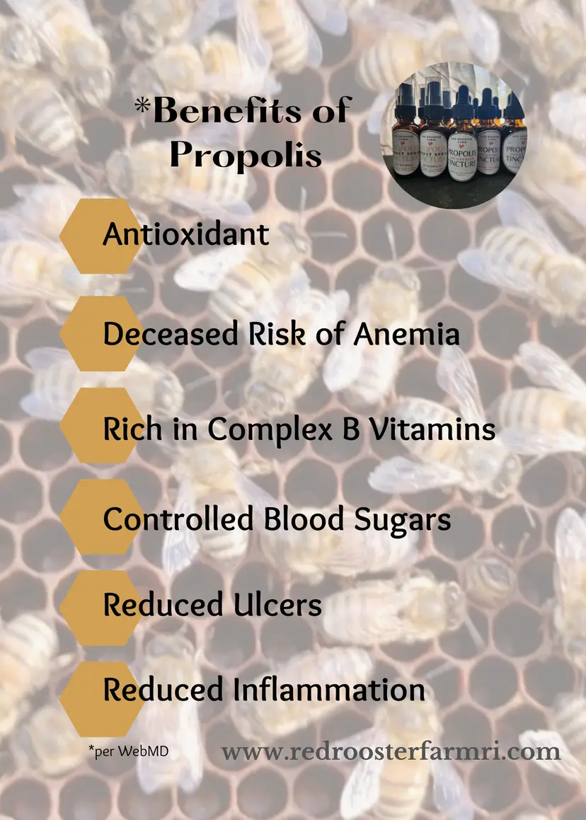 🌿 Key Benefits of Propolis • Natural Immune Support: Propolis is rich in antioxidants and bioactive compounds that help support the body’s natural defenses. • Soothes Sore Throats: Its antimicrobial and anti-inflammatory properties make it a time-honored remedy for easing throat discomfort. • Fights Bacteria & Viruses: Propolis has been shown to inhibit the growth of harmful microbes, making it a natural ally during cold and flu season. • Promotes Oral Health: Used in dental care for its ability to reduce plaque, heal mouth ulcers, and support gum health. • Accelerates Wound Healing: When applied topically, propolis can help speed up the healing of minor cuts and abrasions. • Reduces Inflammation: Its anti-inflammatory effects may help with conditions like sore throats, skin irritations, and even internal inflammation. • Rich in Antioxidants: Contains flavonoids and polyphenols that combat oxidative stress and support overall wellness. • May Help Manage Blood Sugar: Some studies suggest propolis may support healthy blood sugar levels in people with Type 2 diabetes. • Supports Digestive Health: Propolis may help reduce symptoms of gastritis and peptic ulcers caused by bacterial overgrowth.