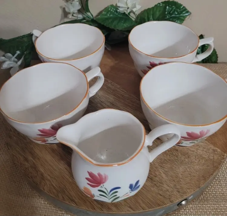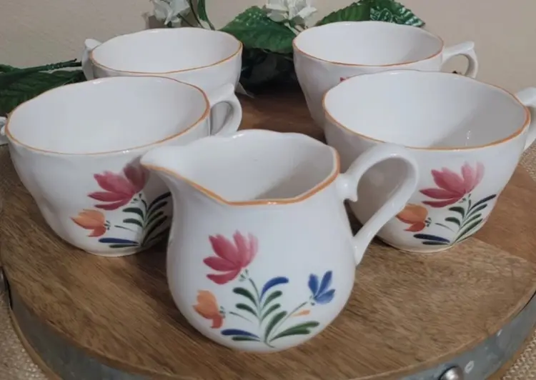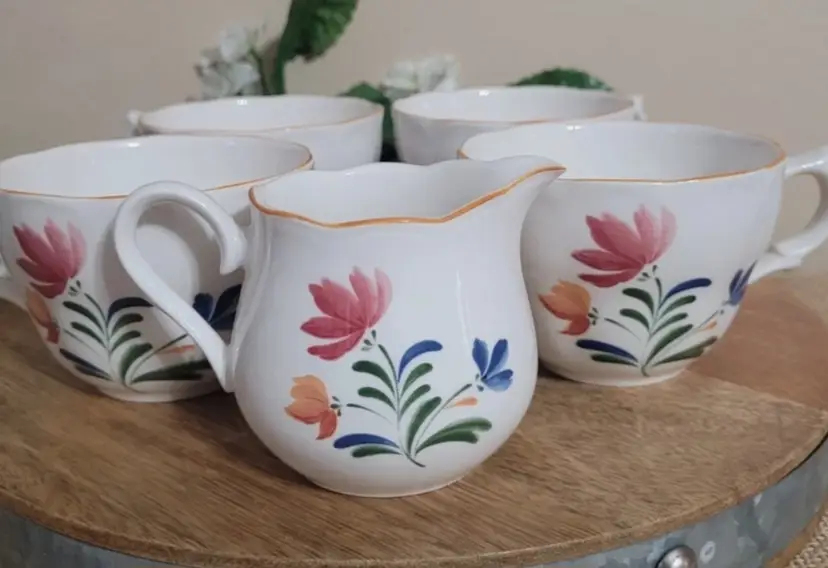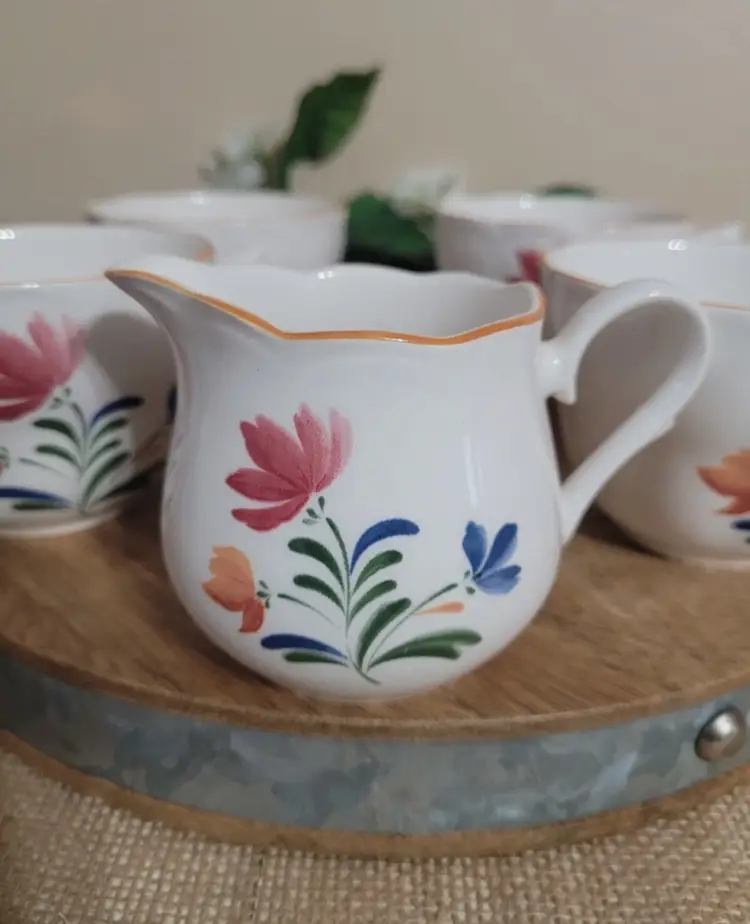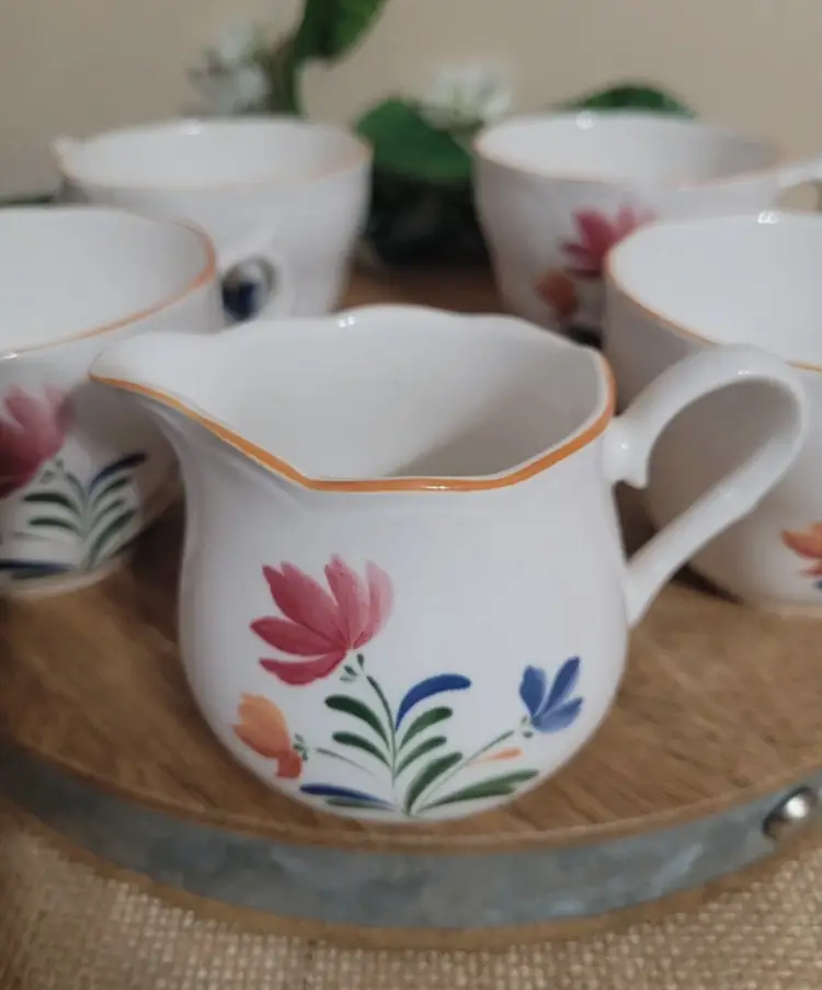 The Provincial Designs Nikko- Avondale Creamer & Tea Cups Set features a charming multicolor design that adds a touch of elegance to your dining collection. Perfect for serving cream at tea time or breakfast, this set is a must-have for any home looking to add a touch of sophistication to their table setting. No chips or cracks. Discontinued pattern.