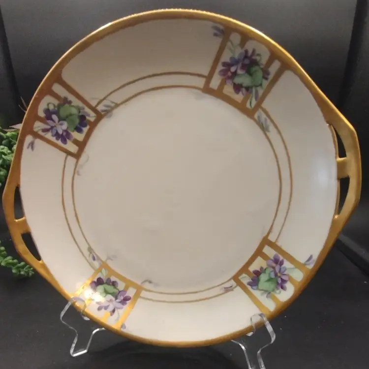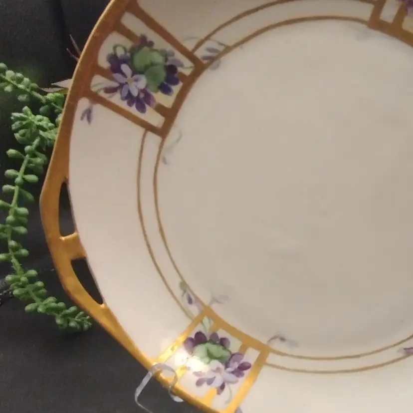 This is a lovely Antique plate with handles which is believed to date to the 1920's era. It has a lovely handpainted Floral Design (Violets?) with heavy gold painted trim.
