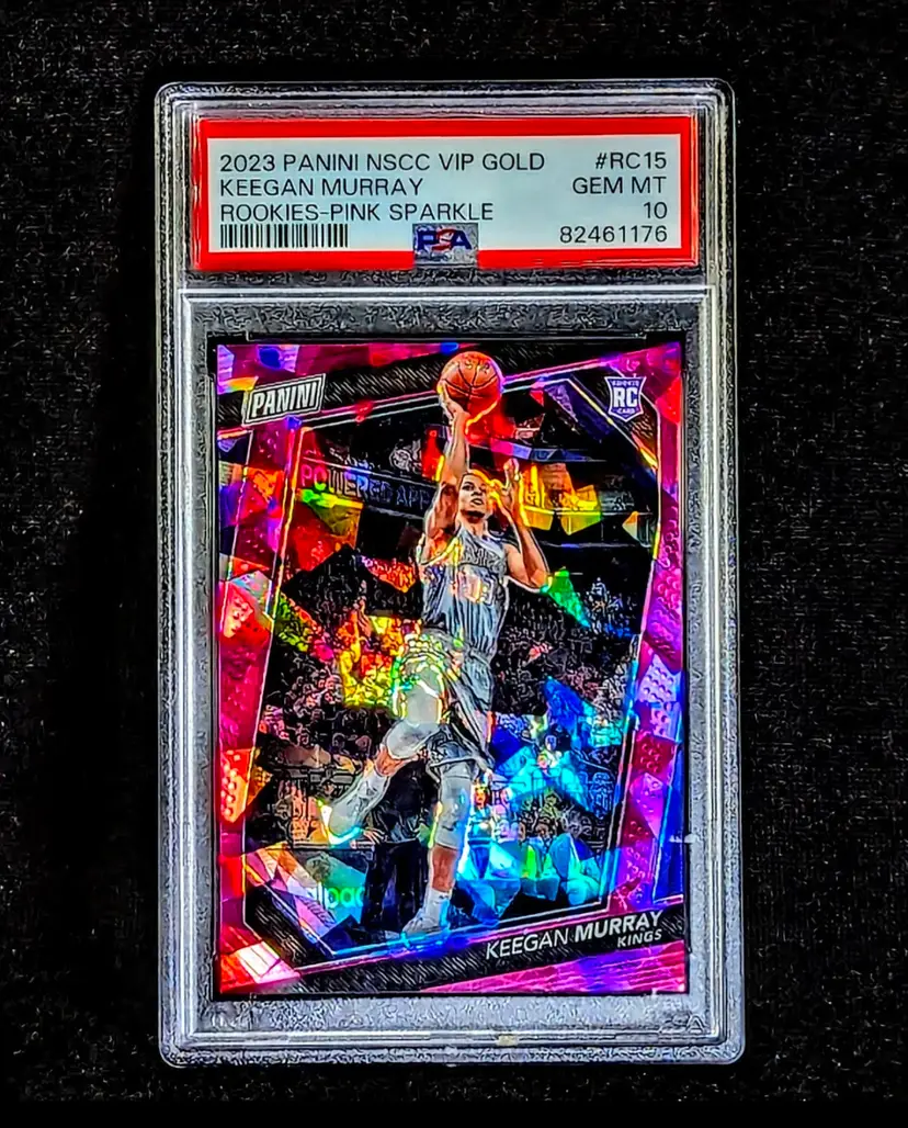 Check out this 2023 Panini NSCC VIP Gold Rookie Card of Keegan Murray, featuring the eye-catching Pink Sparkle design numbered 74/75. Graded PSA GEM MT 10, it's a must-have for any basketball card collector and Hawkeye or Sacramento Kings or just collectors all around.