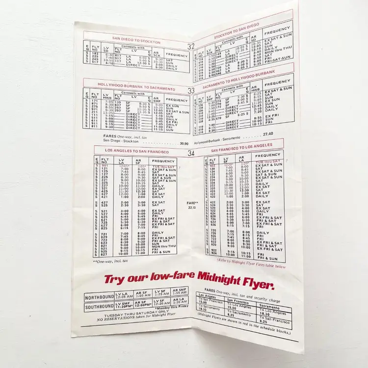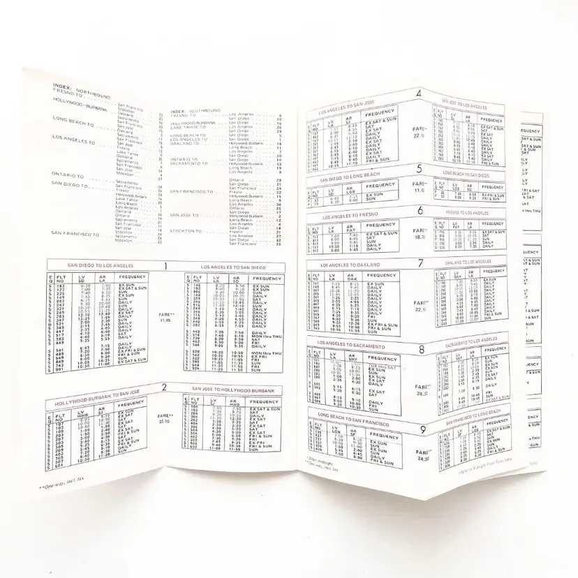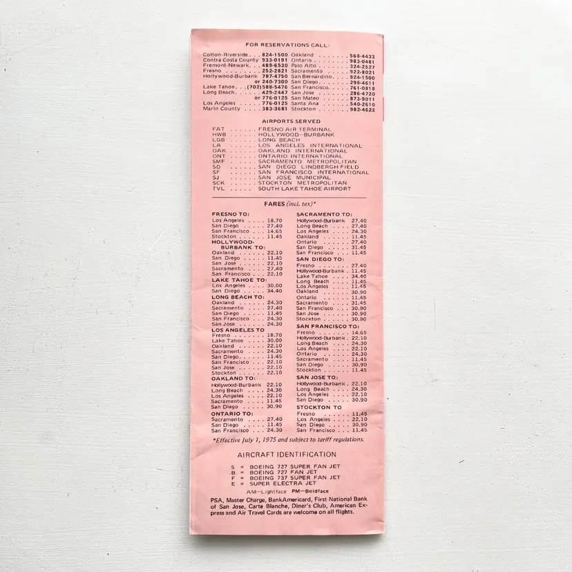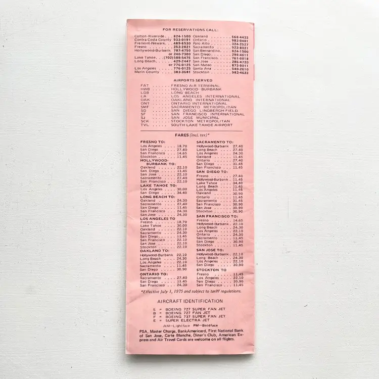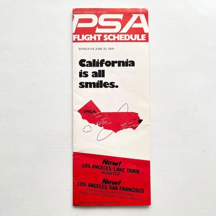 PSA Pacific Southwest Airlines Timetable Schedule Flight Vtg 1970s California Los Angeles to Lake Tahoe Nonstop Los Angeles to San Francisco Every Hour on the Hour Low-Fare Midnight Flier Airline Ticket Fares Aircraft Identification: Boeing 727 737 Super Fan Jet, Super Electra Jet Condition: Wear on the corners. Creases. Measures 9 inches x 3-1/2 inches Packaged in a plastic sleeve inside a rigid envelope