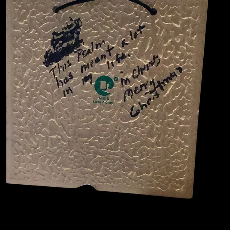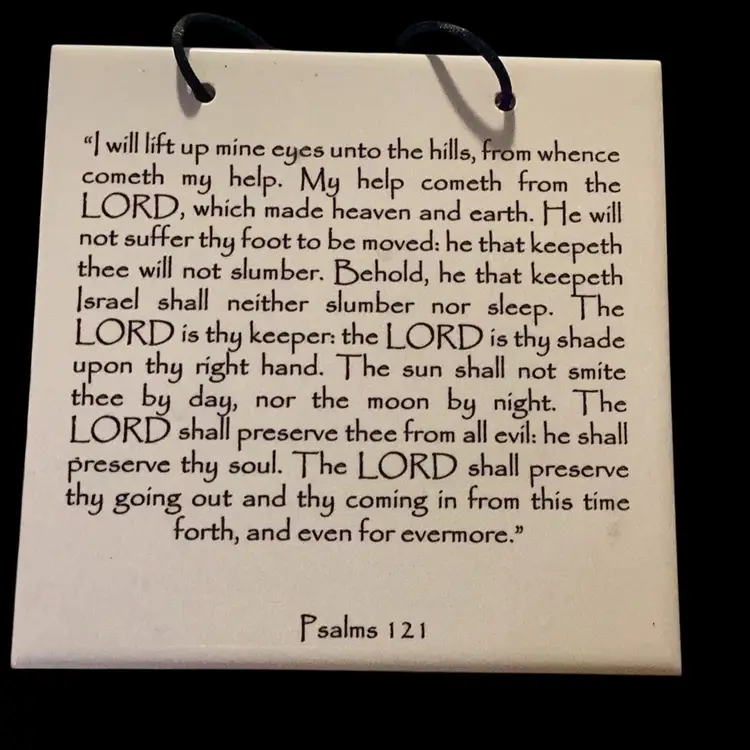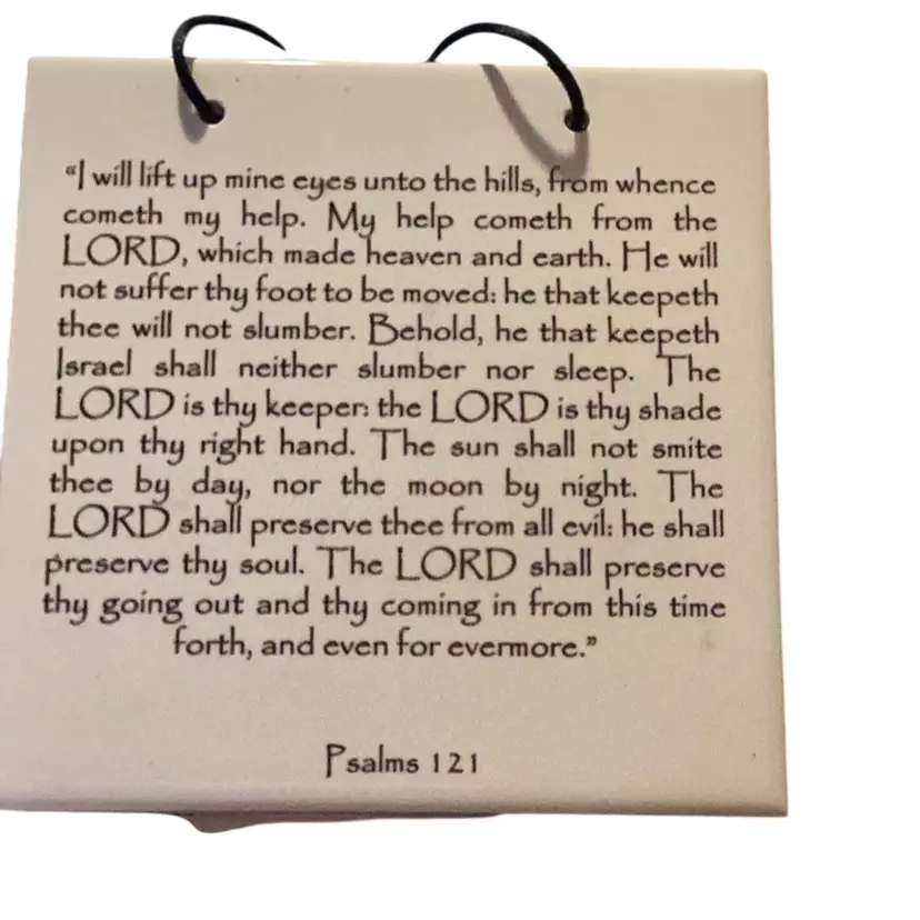 Psalm 121 scripture tile. It is signed on the back this Psalm has meant a lot in my life in Christ Merry Christmas. Somebody got this as a Christmas present. So now I’m giving it to you here at Christmas and New Year’s time measures 6” x 6” it is tile. As always, I do reimburse for overage of shipping.