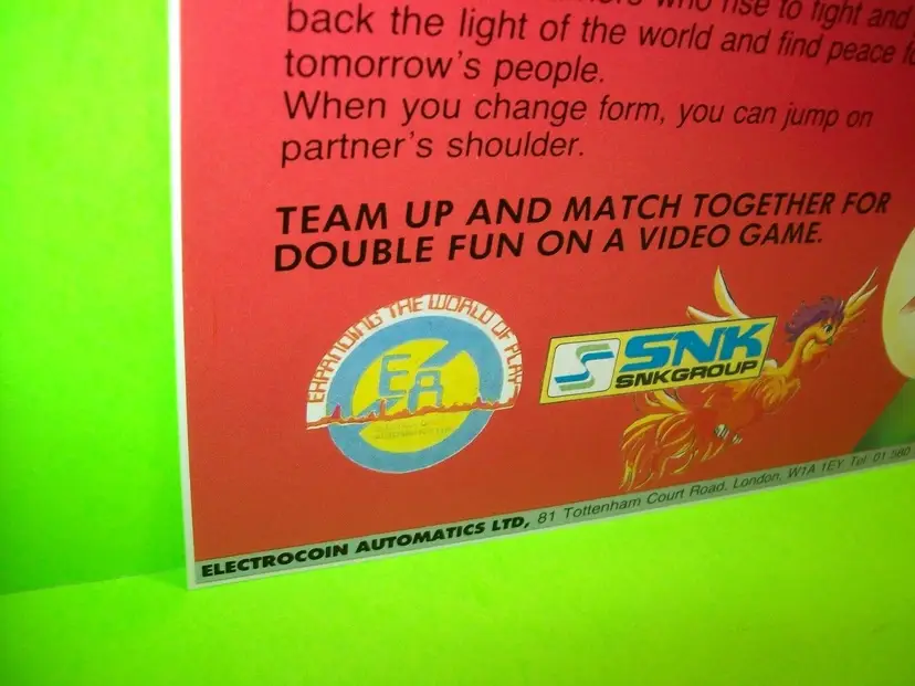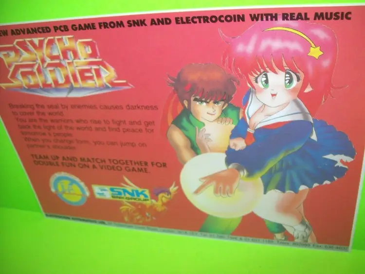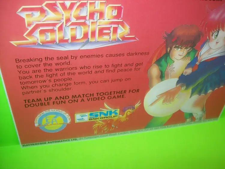 Material: Paper Arcade: Flyer Modified Item: No Country/Region of Manufacture: United Kingdom Original/Reproduction: Original Year: 1986 Game Title: Psycho Soldier Brand: Electrocoin Automatics LTD / SNK