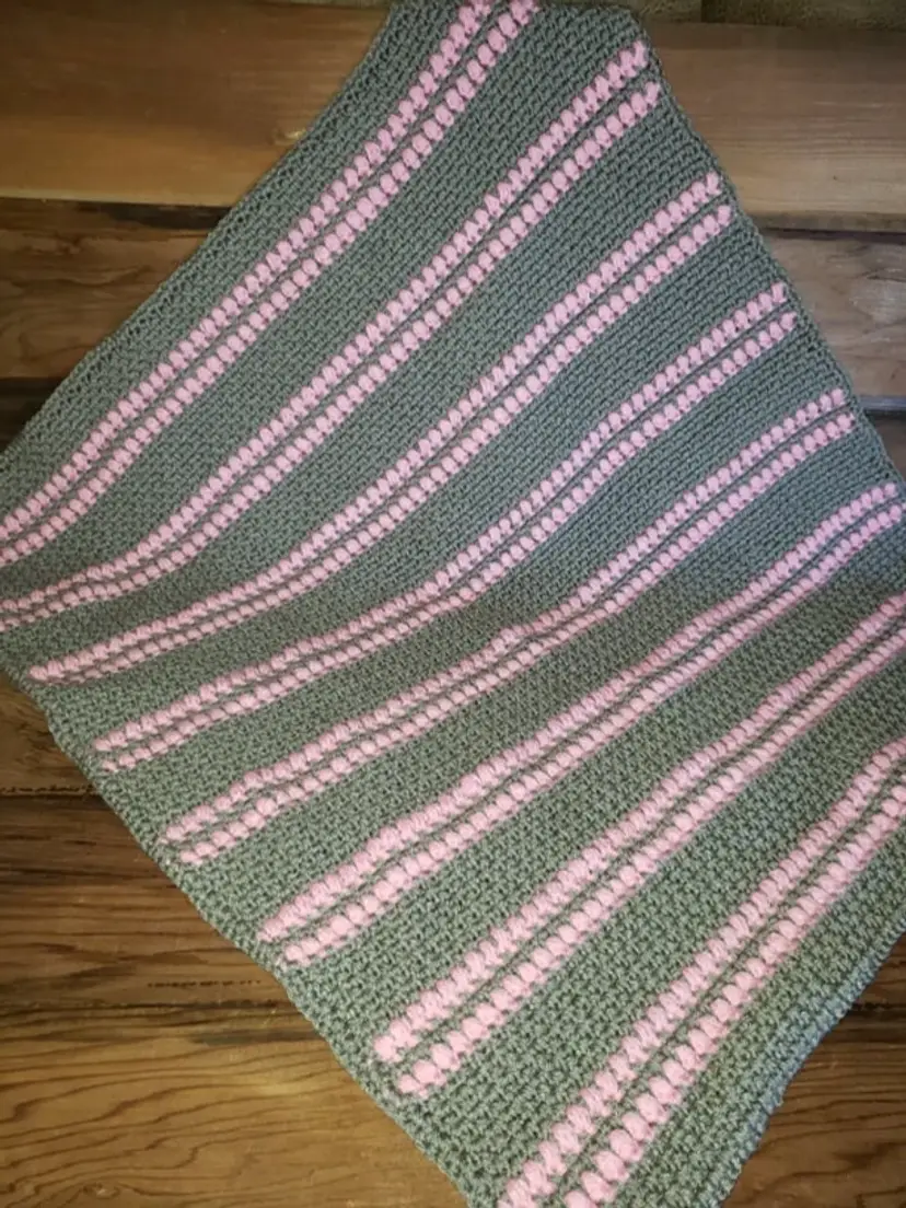 Beautiful blanket with puffs of color used to create a textured stripe design. This blanket is made with a soft gray and pink acrylic yarn.
