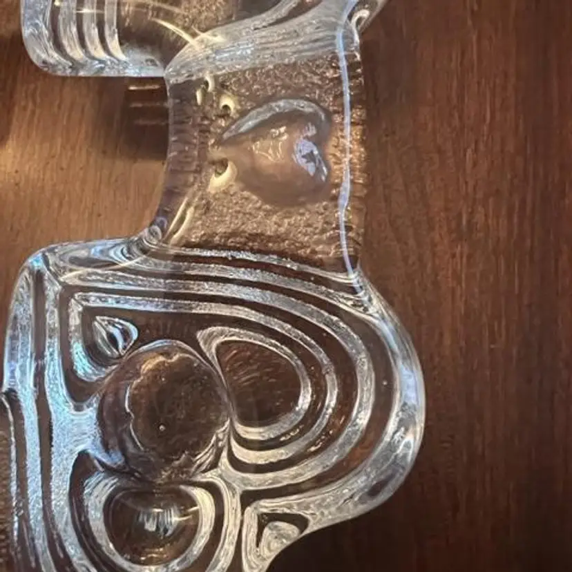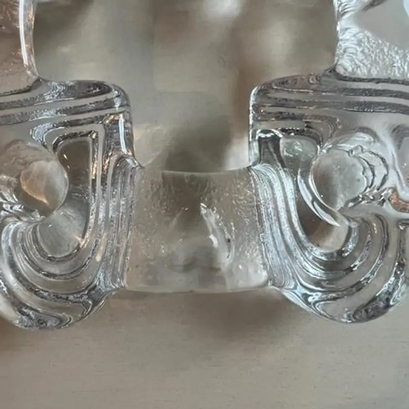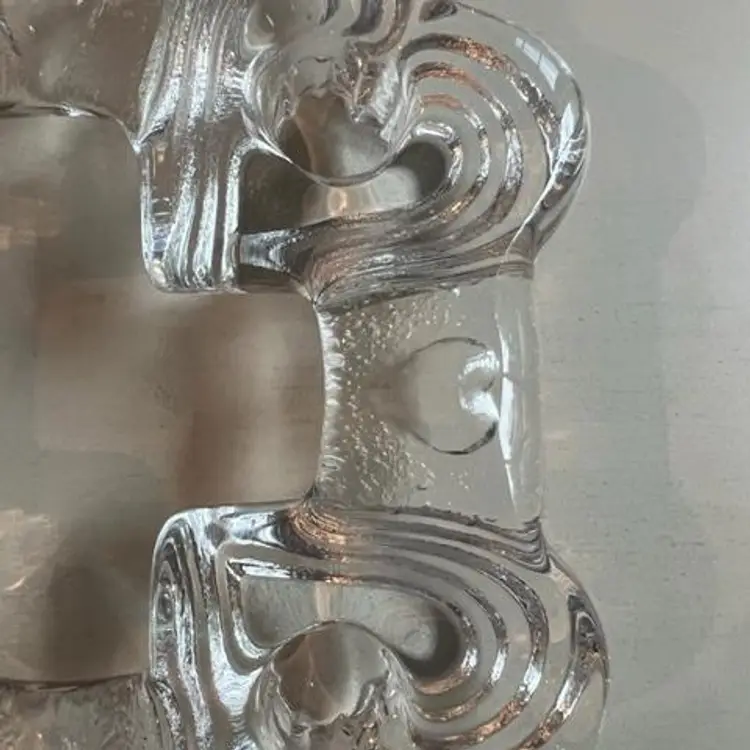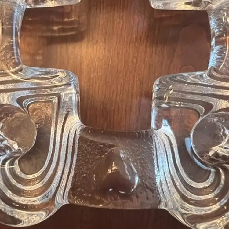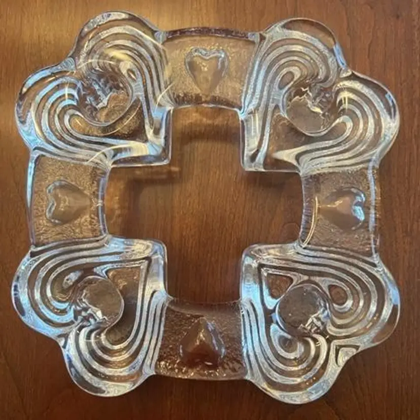 Swedish vintage heavy glass candle holder from the late 1970’s – early 1980’s. Has stepped hearts and holds four standard tapers and can be used for centerpiece or Advent. Measures approximately 6-1/2” squared and sits 1-1/4” high. No chips, cracks or wax residue – looks unused.