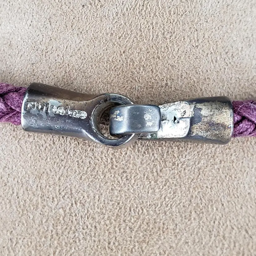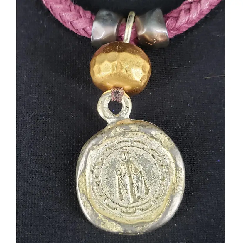 This beautiful Pulccino necklace is a perfect blend of religious iconography and bohemian style. The pendant is a round shape, with a hook closure, and is signed by the artist. The necklace is made of high-quality metal and cotton materials, with a yellow gold plating that adds a touch of elegance to the overall design. The necklace is 18.5 inches long and has a unique amulet design that is perfect for both men and women. The pendant is crafted with intricate details, making it a true work of art. This necklace is perfect for those who are looking for a meaningful piece of jewelry that reflects their religious faith and bohemian style. There is wear on the clasp, please see pictures.
