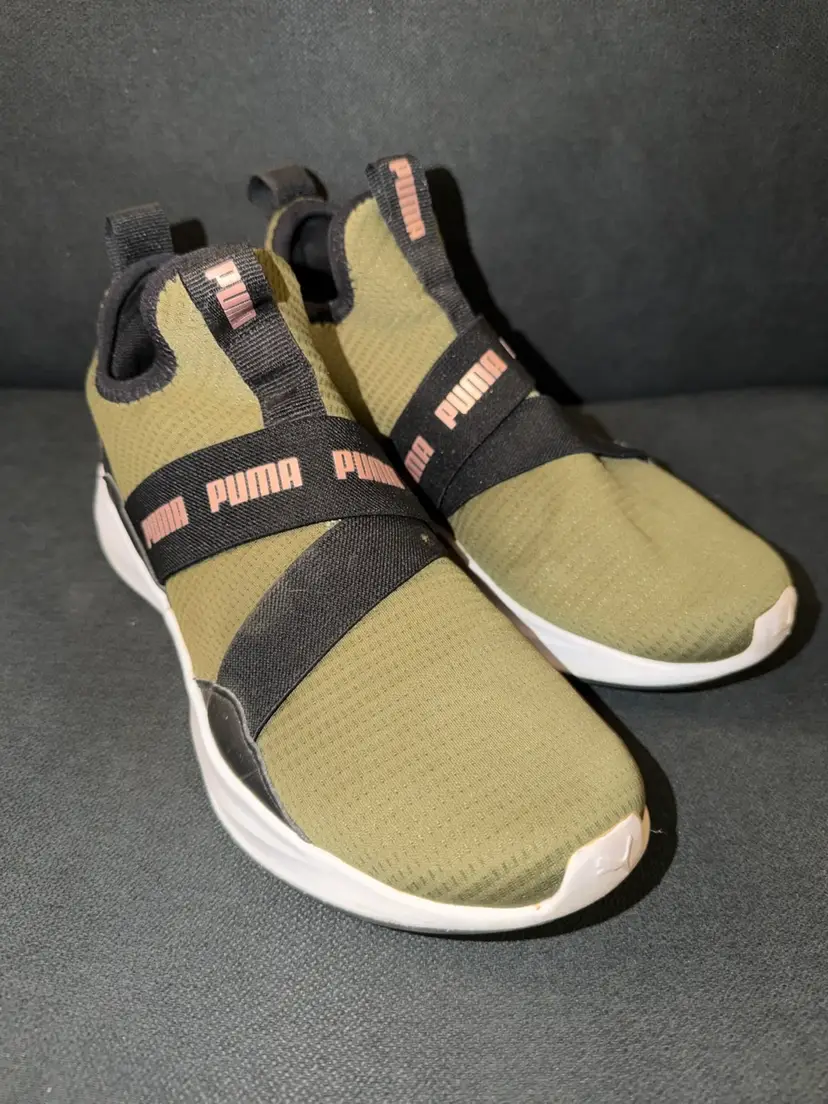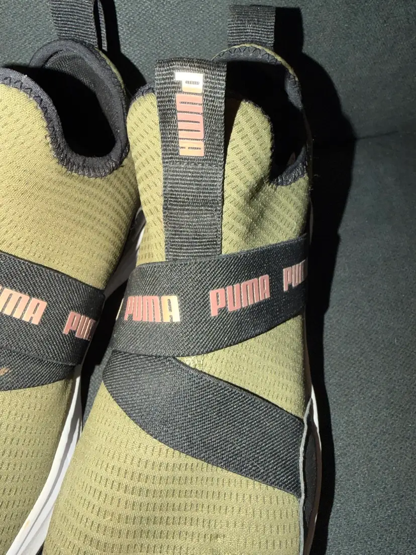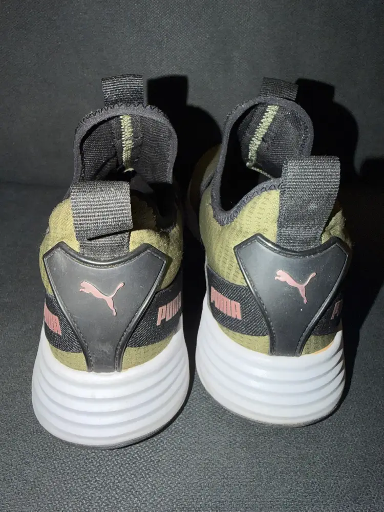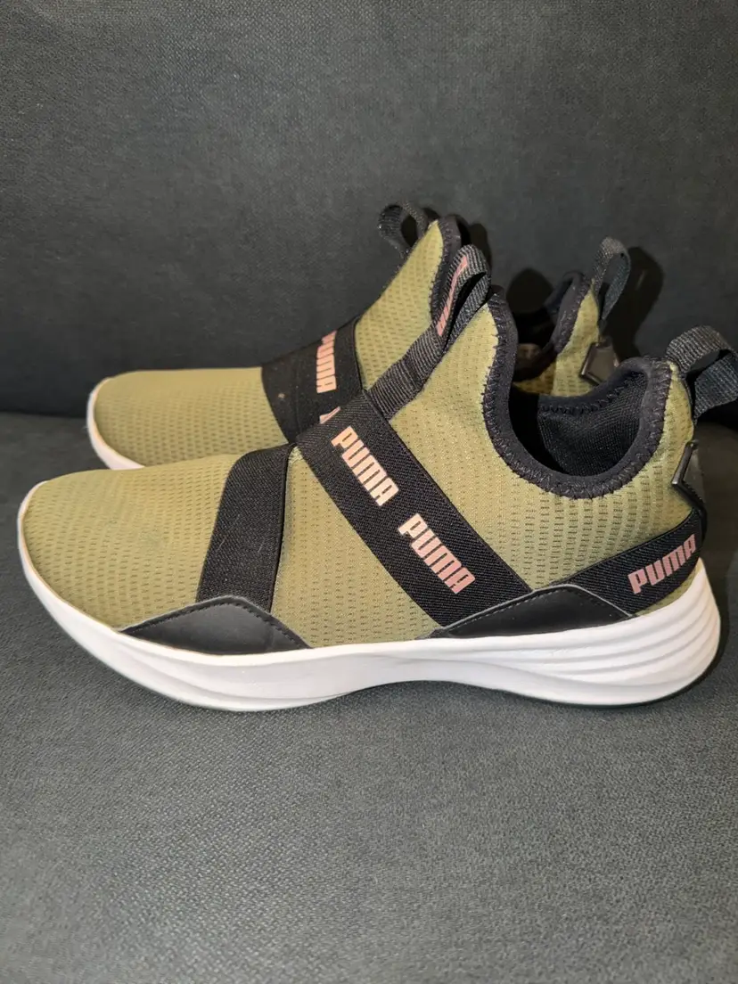 Sleek Puma shoes in olive green, black and rose gold. Modern design with comfortable fit. Very lightweight size 8