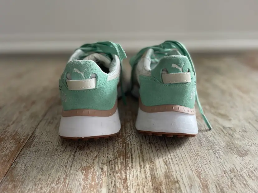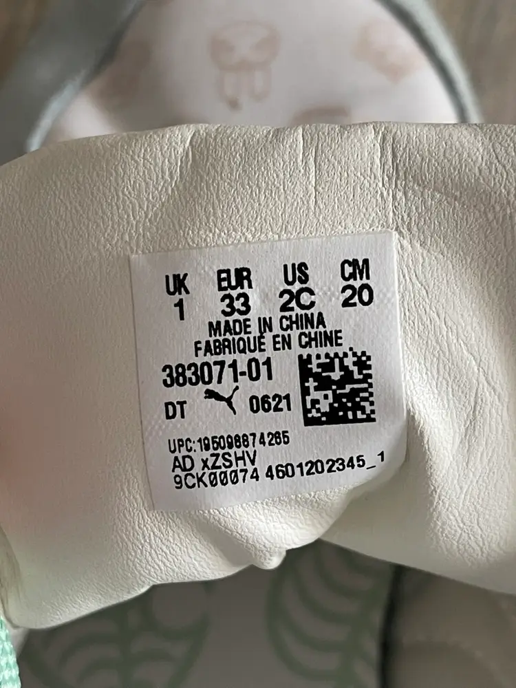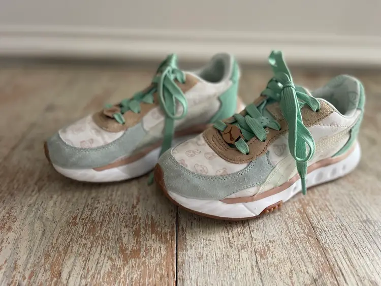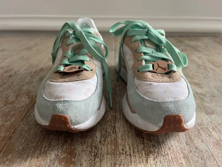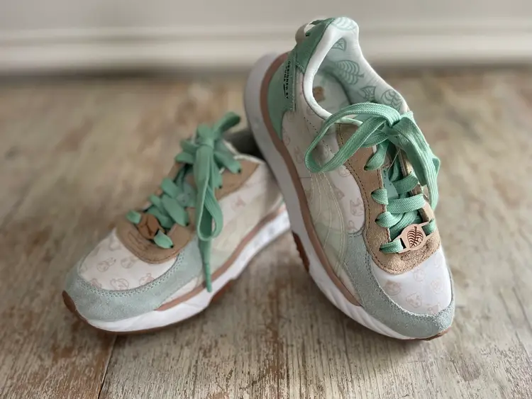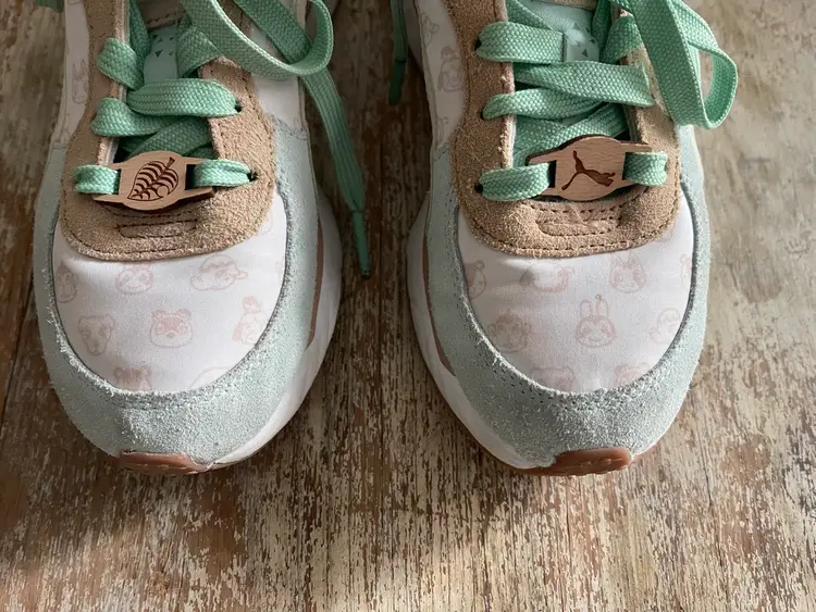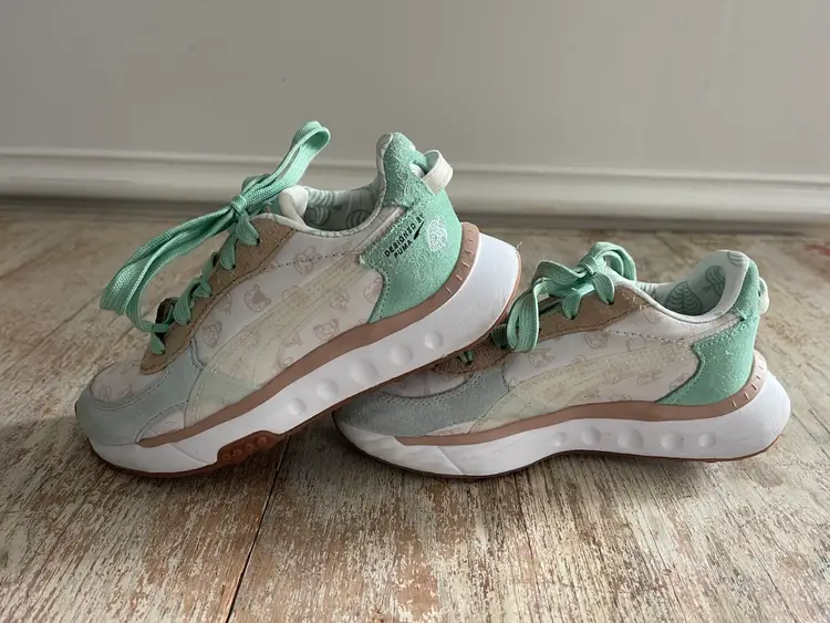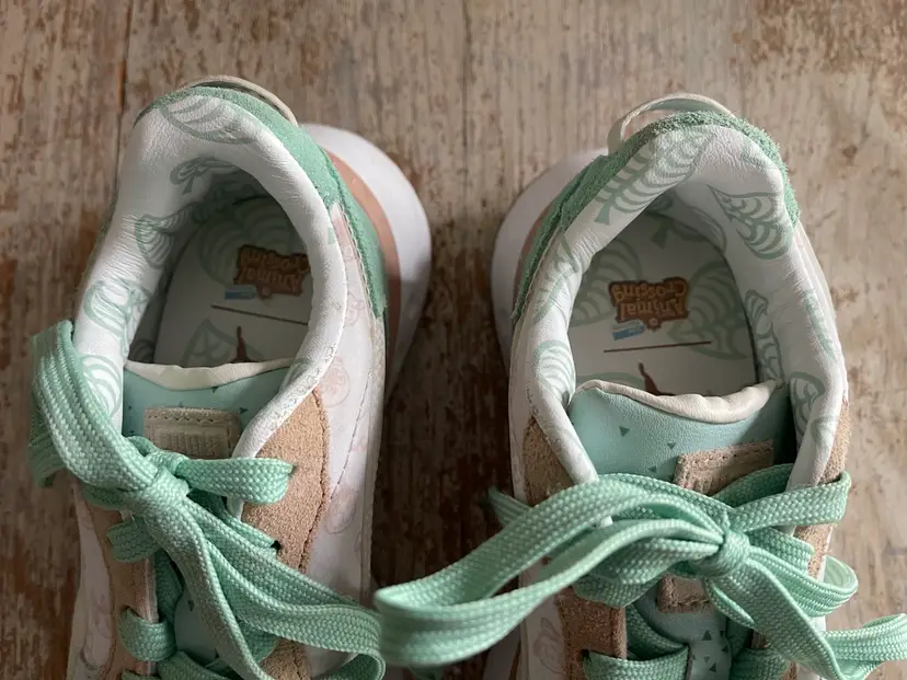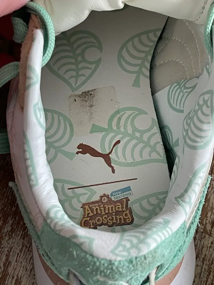Puma x Animal Crossing Jr Collab Sneakers New Horizons Youth Size 2 Suede and Fabric Blend Upper All Over Print Nook Leaf Details Light Sky Laces Limited Edition Shoe c2021 NO Box
