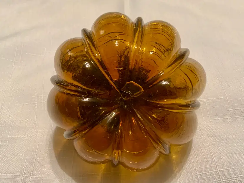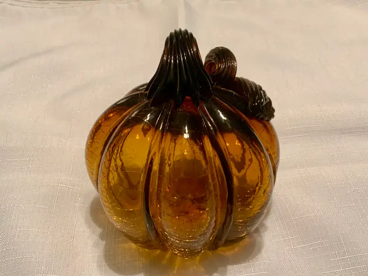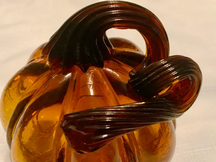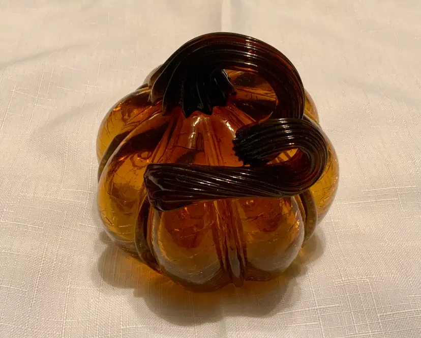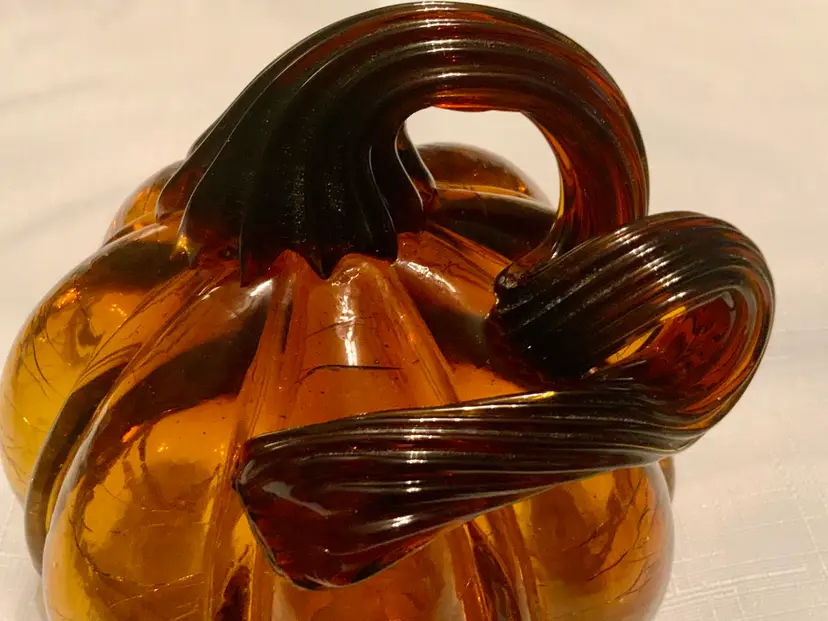 Pumpkin hand blown art glass. Amber brown in color with swirl twisted vine. Beautifully crafted by hand with textured surface. Perfect for Fall, Halloween, Thanksgiving, etc. Adding charm to any room.