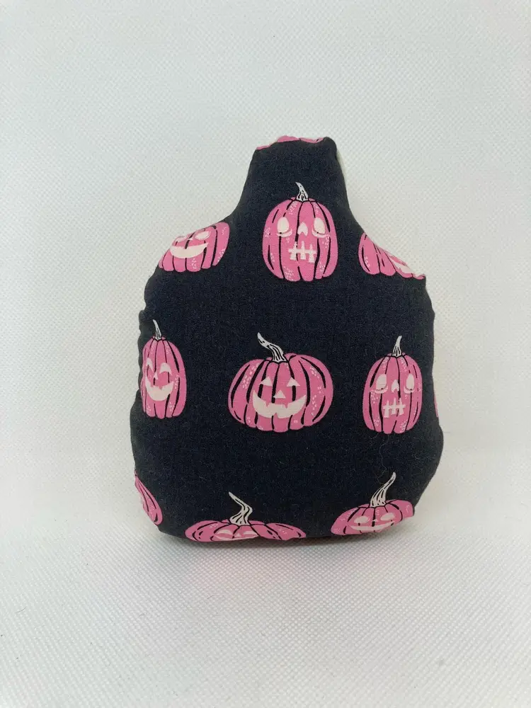 This smile could brighten up your day if you brought Mr. Pumpkin home with you! He is made with Art Gallery Designs fabric and stuffed. He is 6" tall, 5" wide and 3" deep. New.