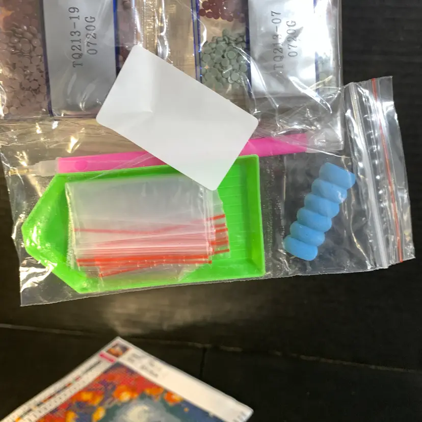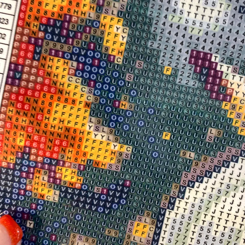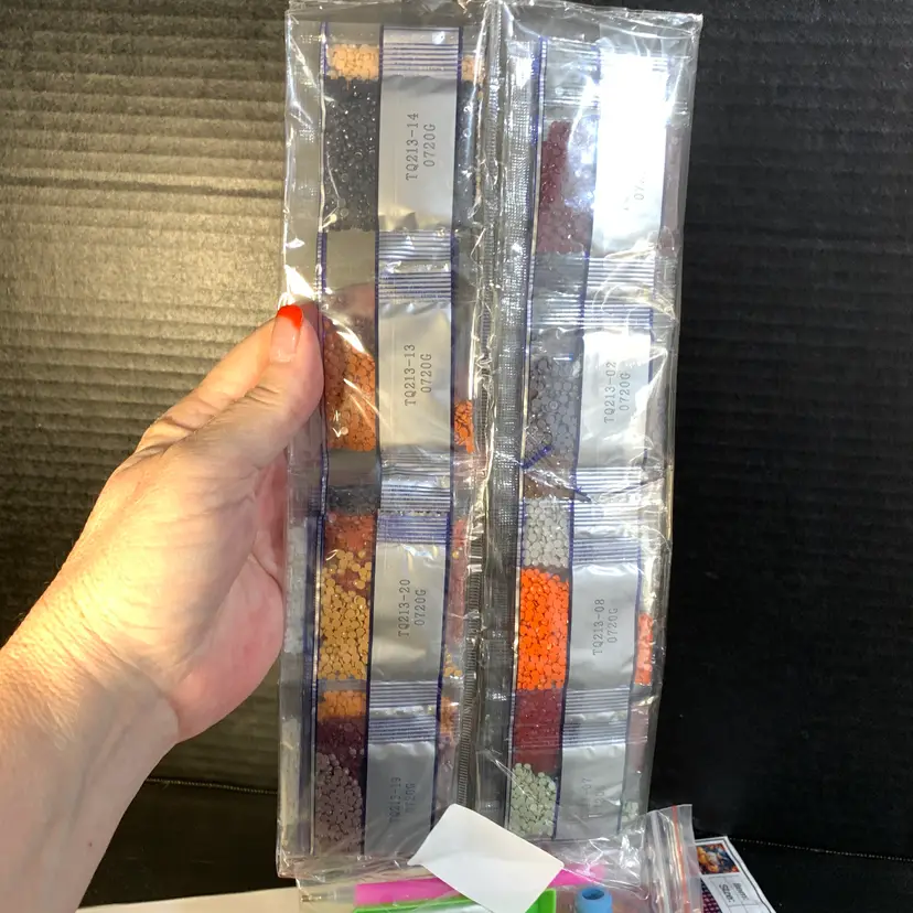 So festive! Includes everything you see in the photos. Finished art measures 11 7/8 inches by 11 7/8 inches. Weighs 5 ounces. If the actual postage ends up being less than what you paid, you will be refunded for anything over one dollar.