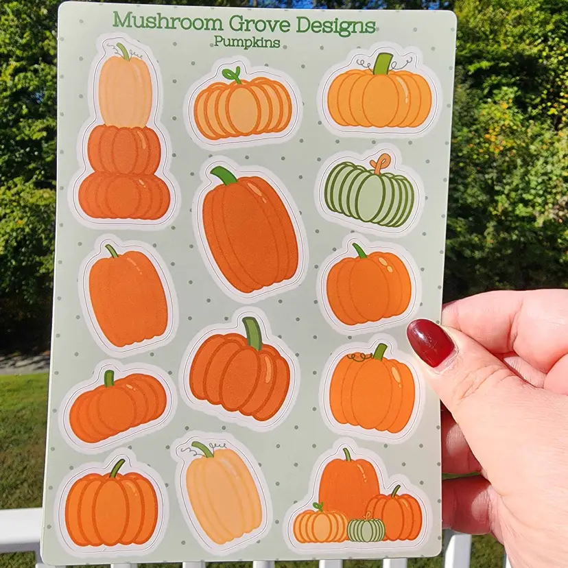 This sticker sheet features 13 adorable pumpkins. Each sticker sheet measures 5x7 inches (12.7x17.8 cm) with each pumpkin measuring approximately 1x1.5 inches (2.54x3.81 cm)