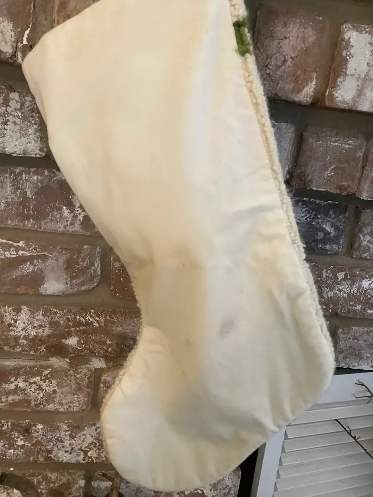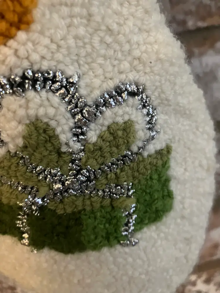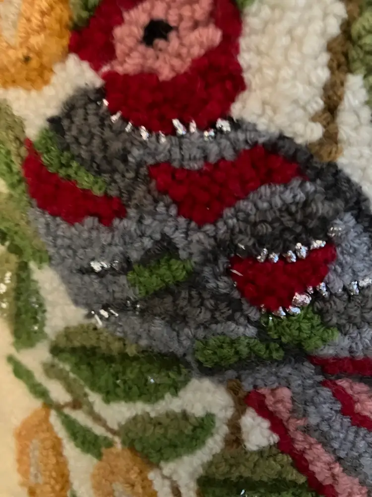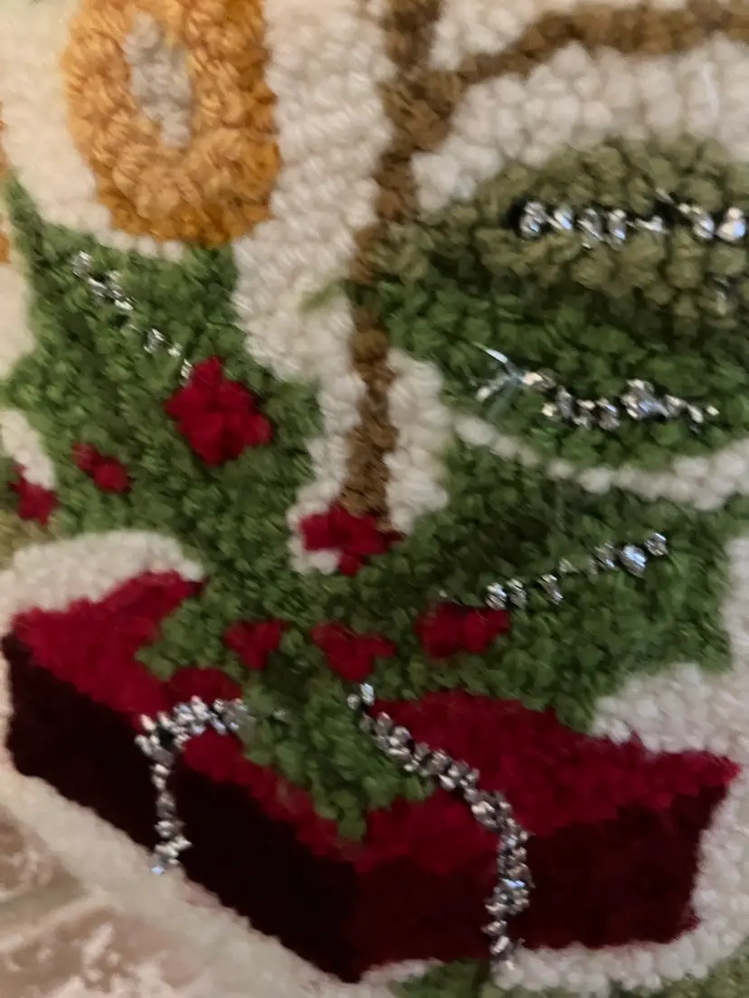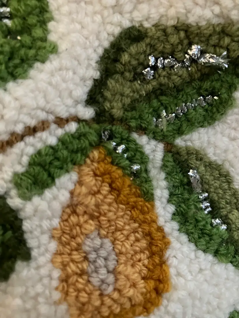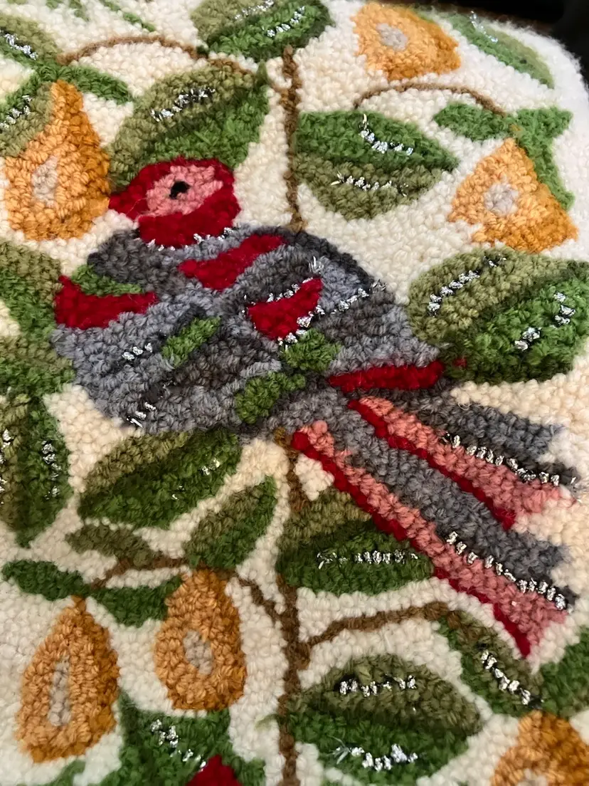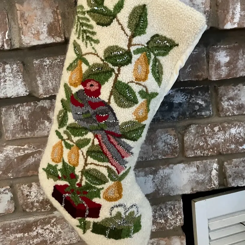 Unique punch needle Christmas stocking (rug like process) in vibrant colors on creamy white, featuring partridge (bird) and pears in colorful design including metallic yarn highlights 10” x 22” x 2”