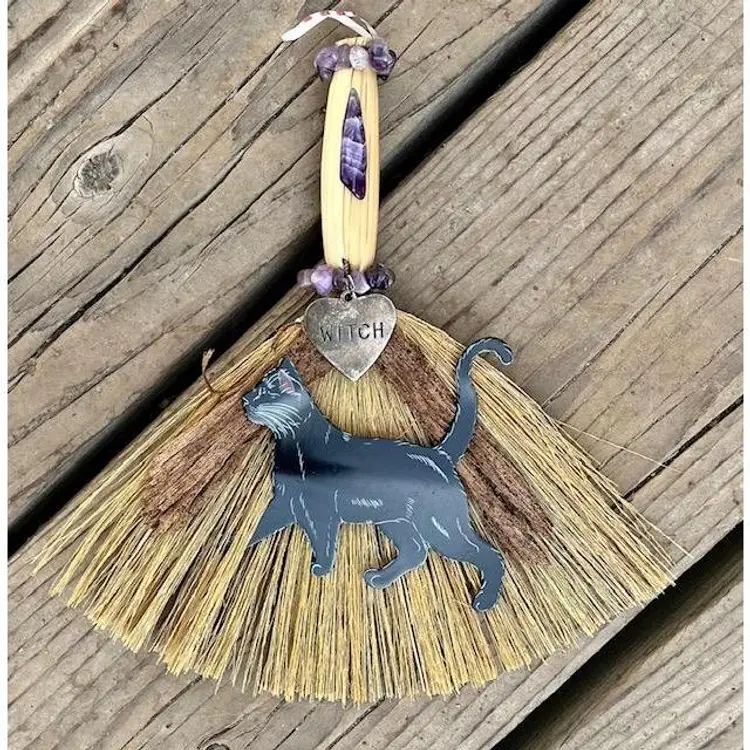 A Besom Broom accented with Purple Amethyst, A Black Cat and Witch Pendant. Pendant and cedar peel. 7" Long & 6" Wide. For your Kitchen or other Special Space. Hand Crafted.