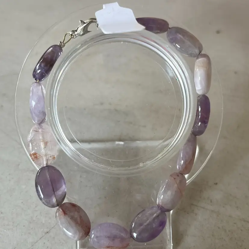 Glass beads with lobster claw enclosure fits 7.5-8.5 wrist. Beautiful