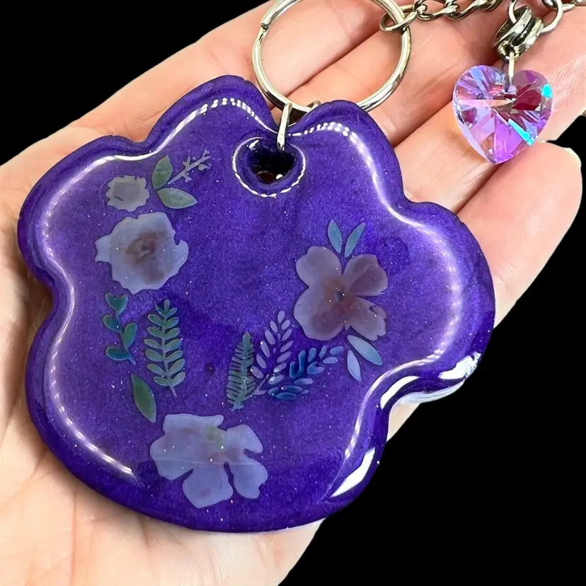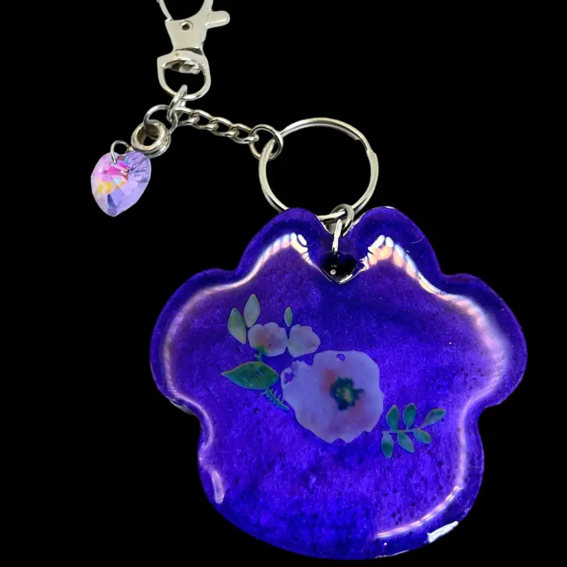 Vibrant purple with flower designs on both sides dog paw keychain bag clip. Adorable Glass Purple Heart Charm.