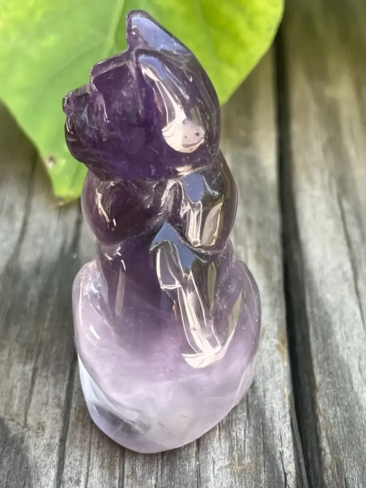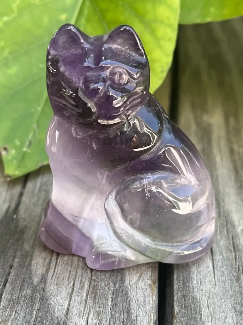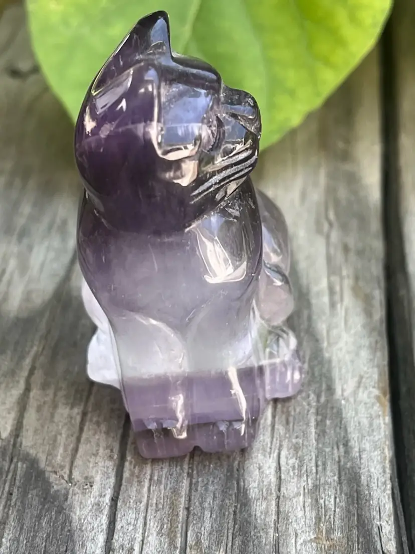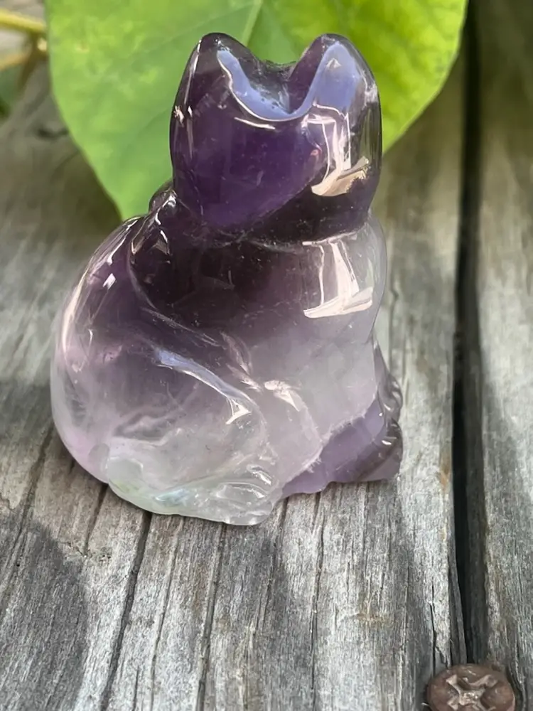She's a beauty! A Purple Fluorite carved cat. She measures approximately 2 inches tall, 1 1/2 inches wide and a depth of 1 1/4 inches. 70 grams. She's out of my personal collection. I have had her approximately 8 years ago. Excellent condition.