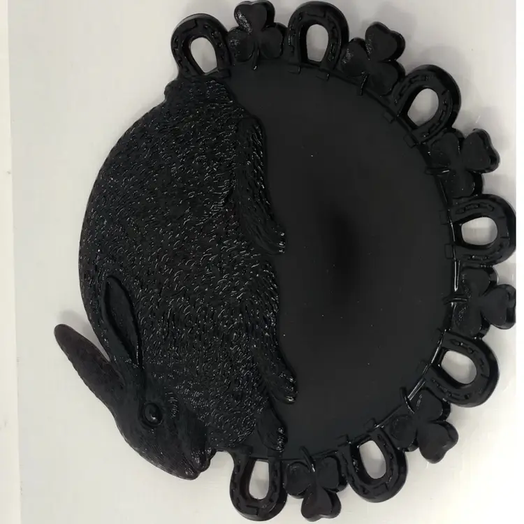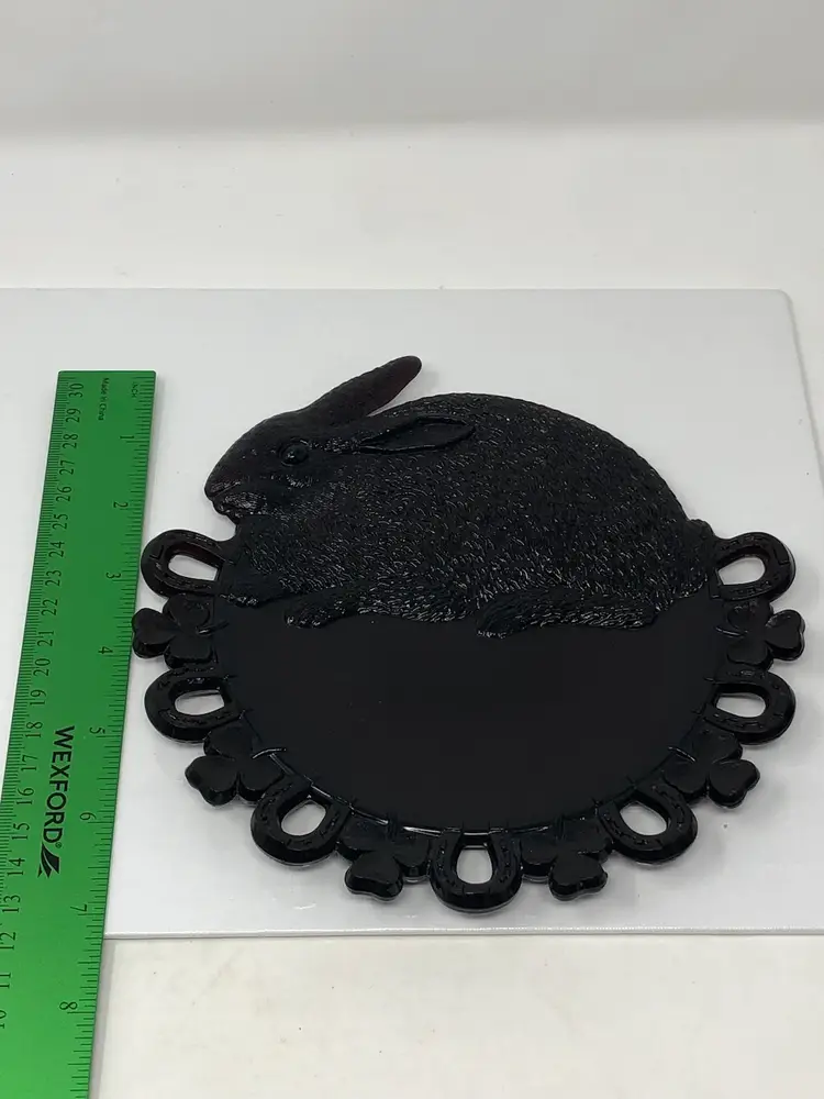 7 1/2" glass plate with rabbit, horseshoes and clovers. Marked Westmoreland on the back. Beautiful purple glass, no chips or cracks