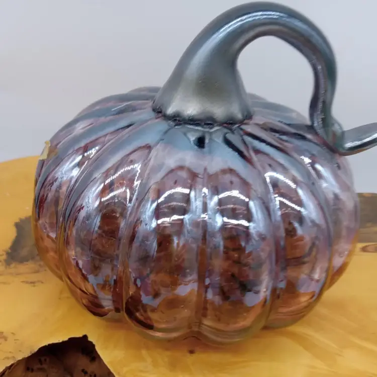 Here's a cute glass pumpkin. It's purple speckled with a silver iridescence. It's 4.5 inches tall and 6 1/4 inches in diameter. NO chips or cracks.