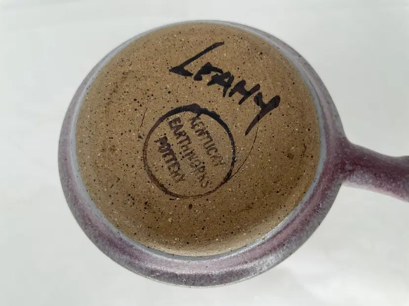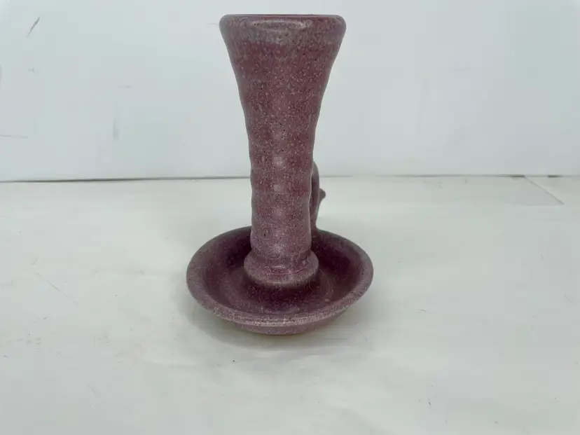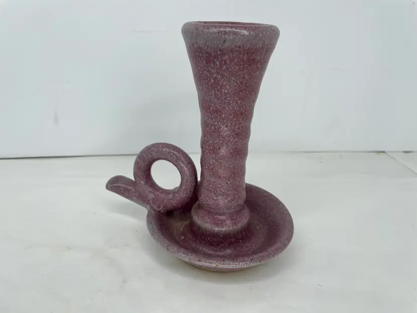 This exquisite candlestick holder is a unique piece of art pottery from Kentucky Earthworks Pottery. The striking purple color and intricate design make it suitable for any room in your home. The holder is signed by Leahy and features a finger loop for easy handling.