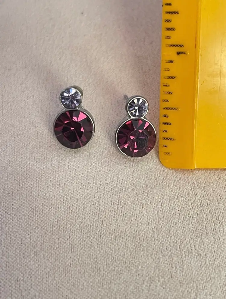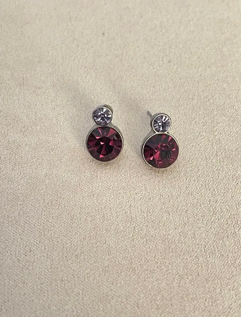 Dainty and eye-catching pierced studs featuring two round stacked purple crystals—light lavender on top, deep plum below—set in sleek silver-tone metal. Perfect for adding a pop of sparkle to your everyday or evening look.