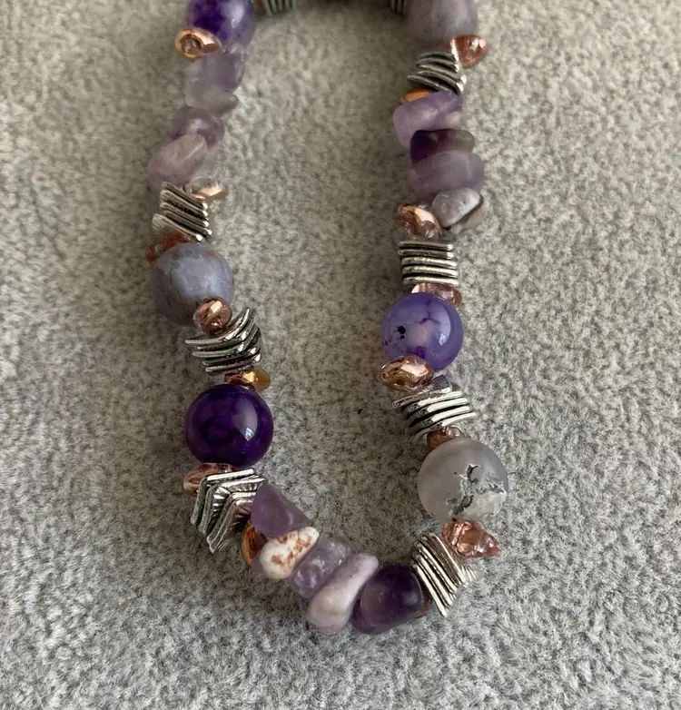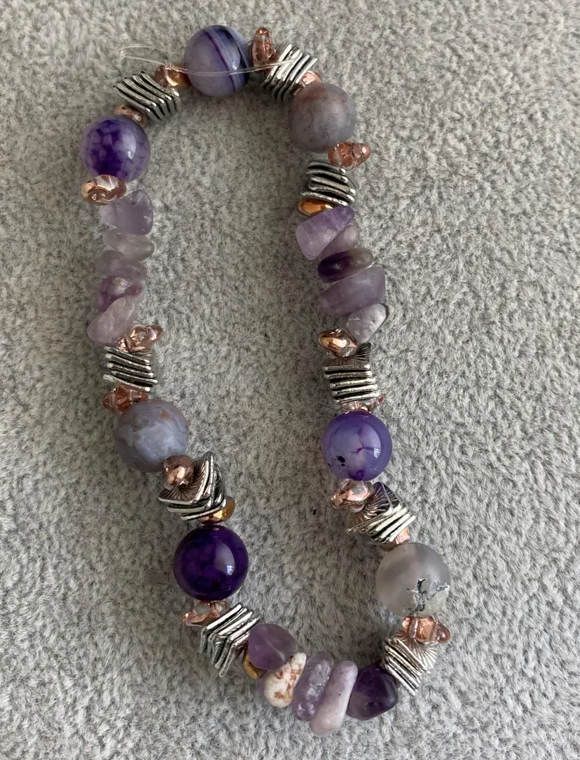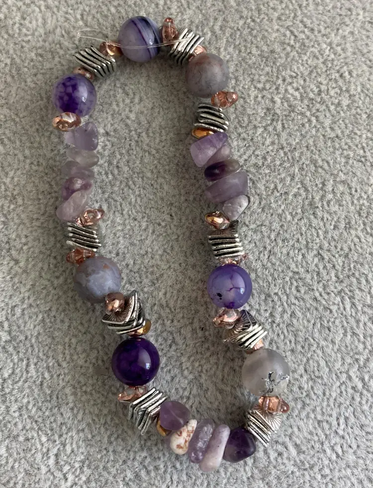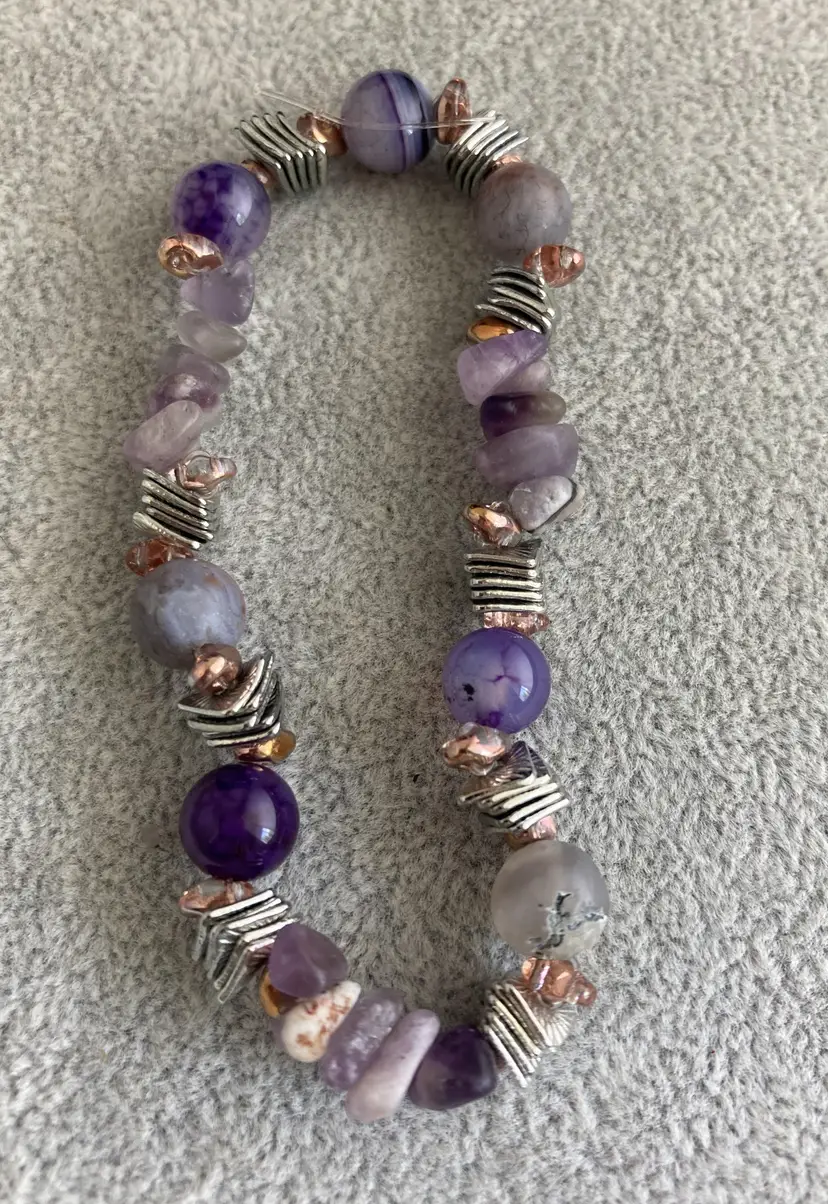 This is a amethyst and agate bracelet with silver accents on elastic.