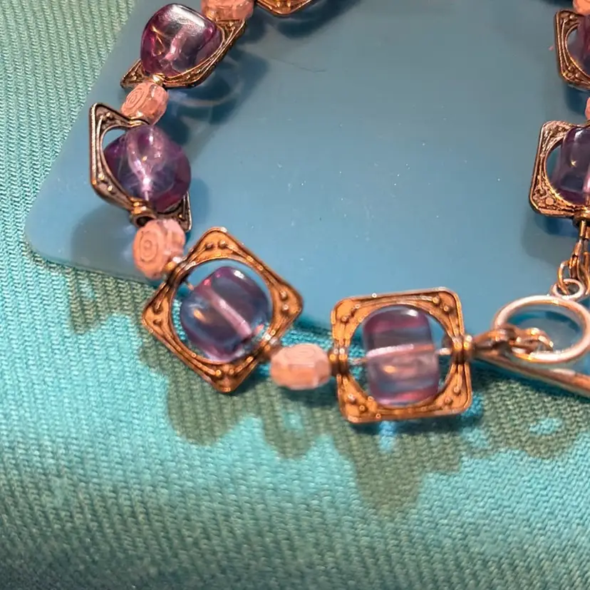 This bracelet is pretty. It’s got purple stones encased in little square casings and the beads can move around so you can call it a fidget bracelet.