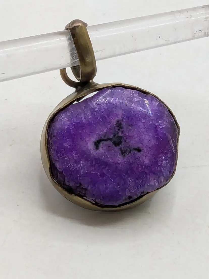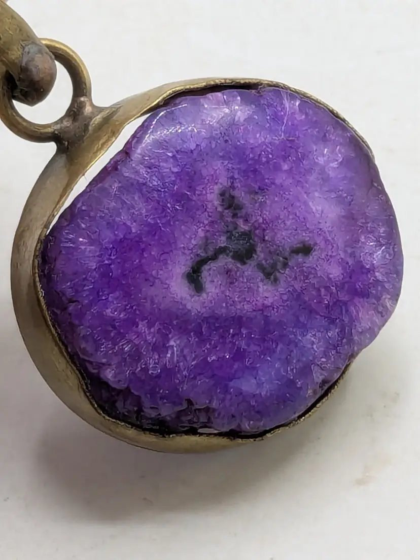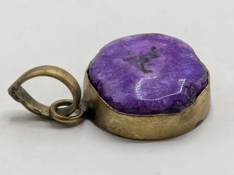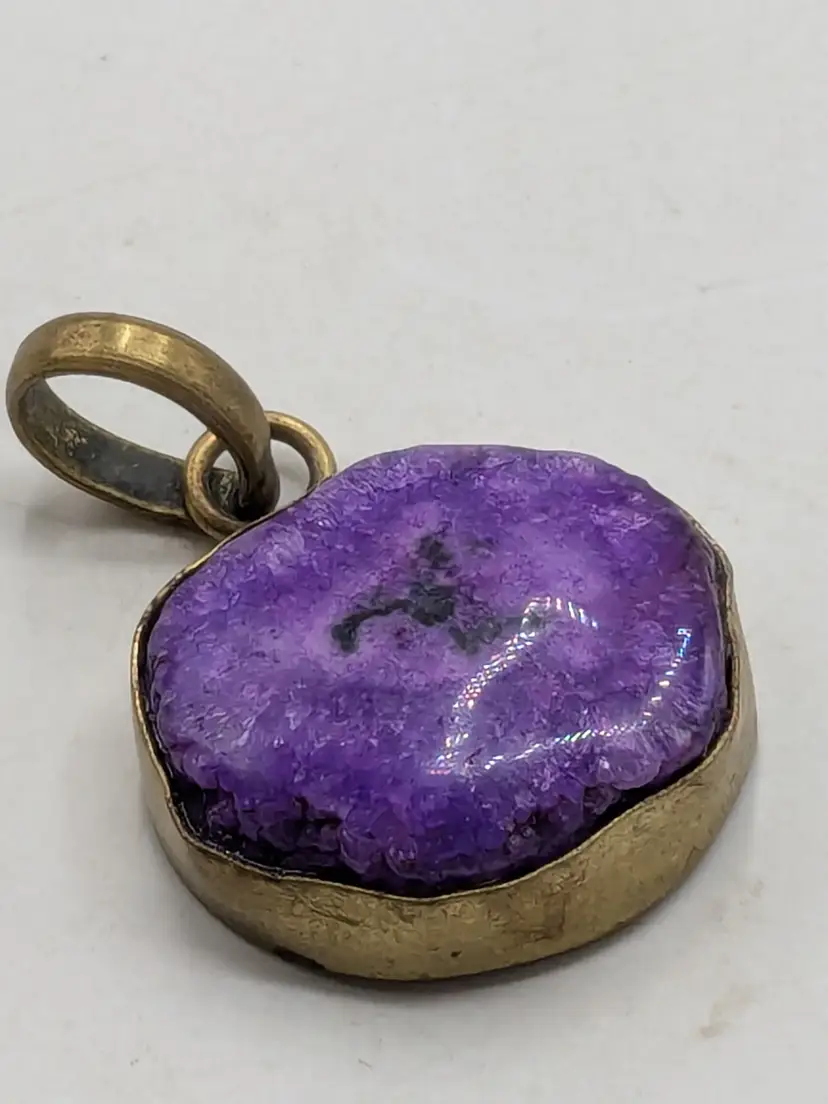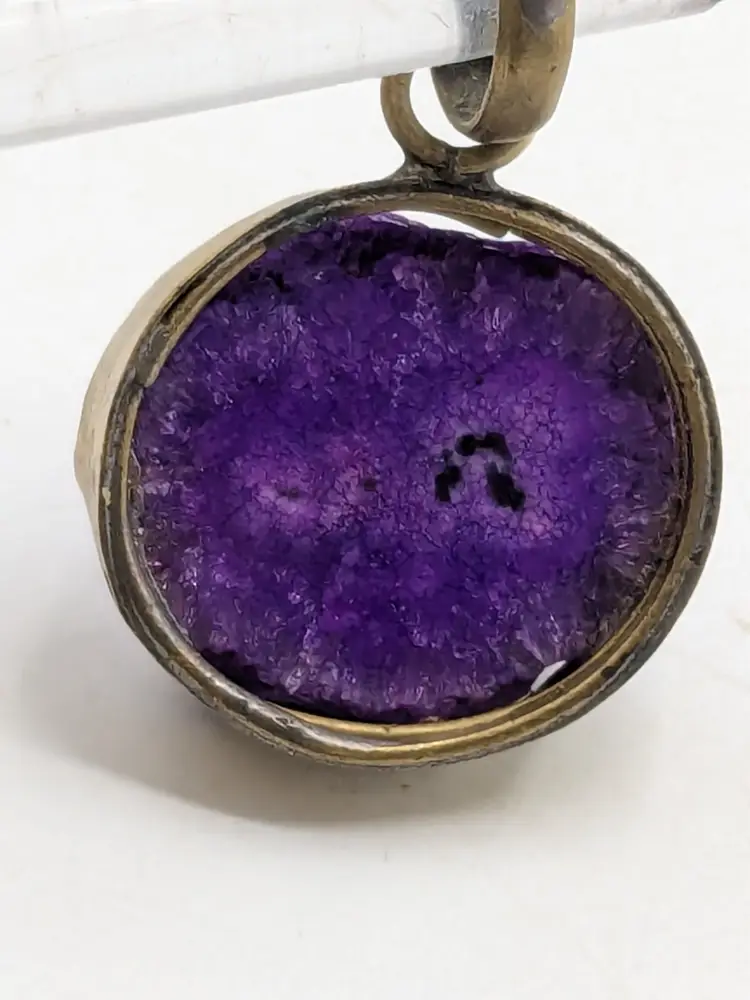 Good condition. Features a vibrant purple quartz set in a brass bezel. Measures 3/4" in length and 1" wide. wen