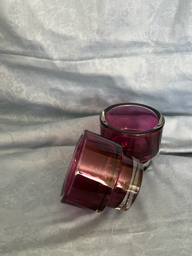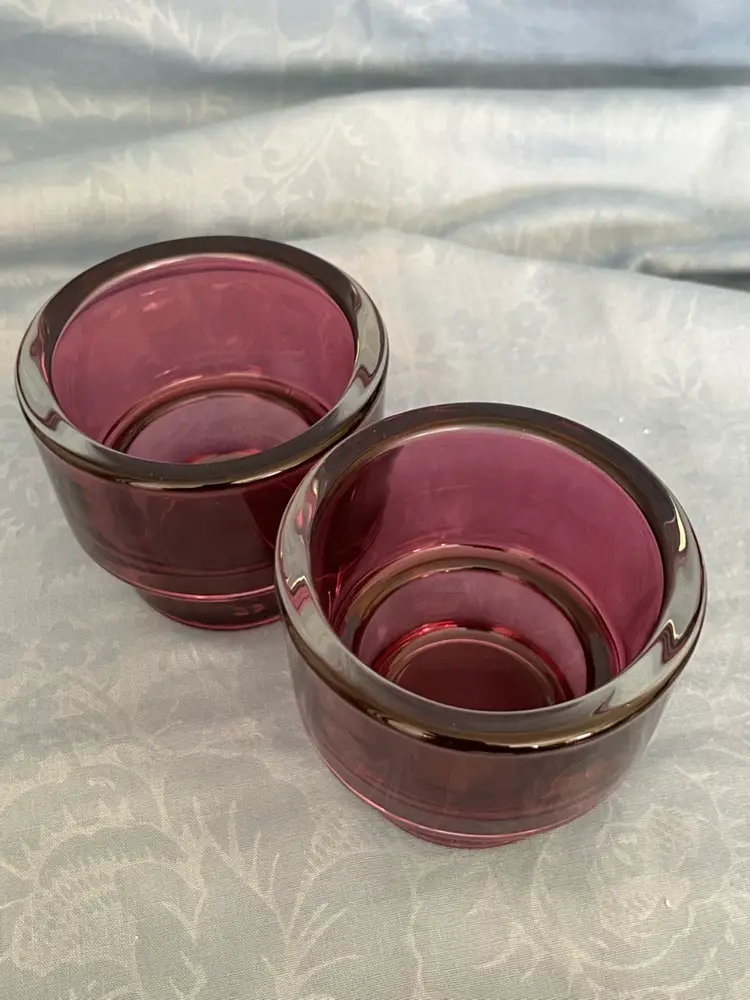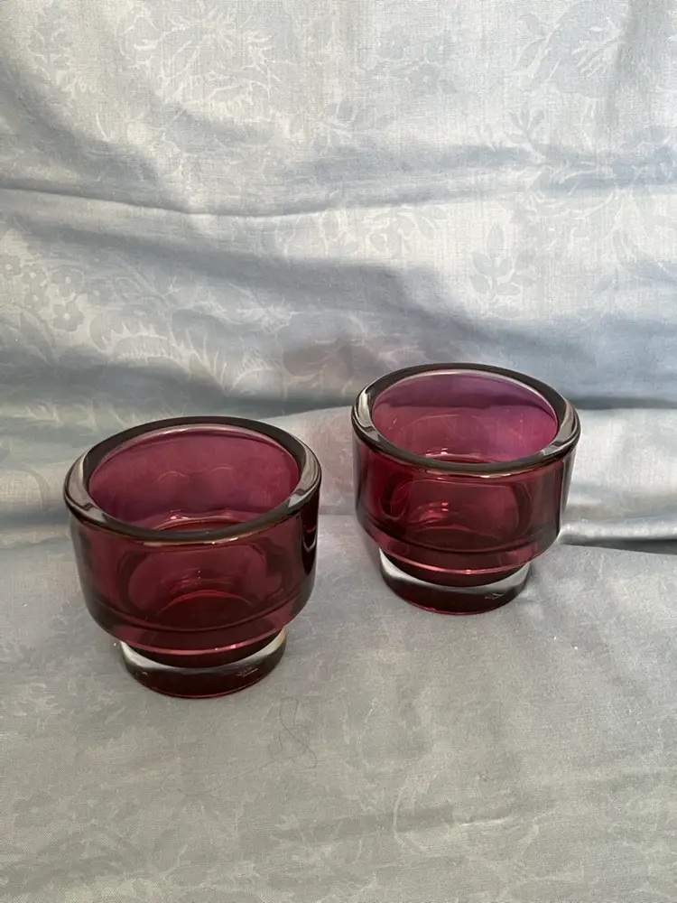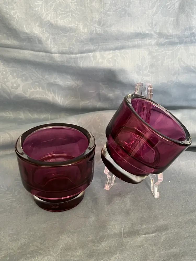 Don’t let there 3 inch height fool you! These beautiful stackable deep purple votive candle holders are amazingly thick and heavy. The bottom portion is a clear glass for a sleek look.