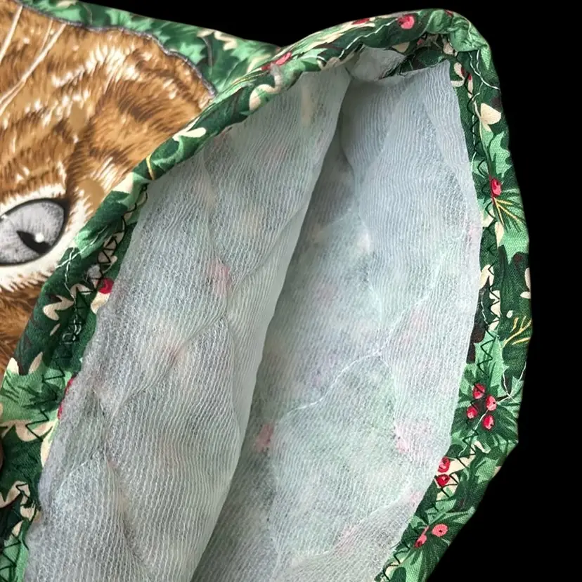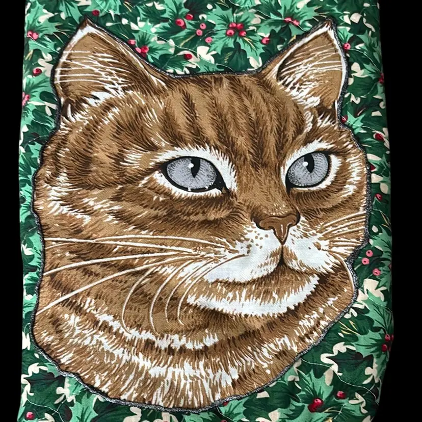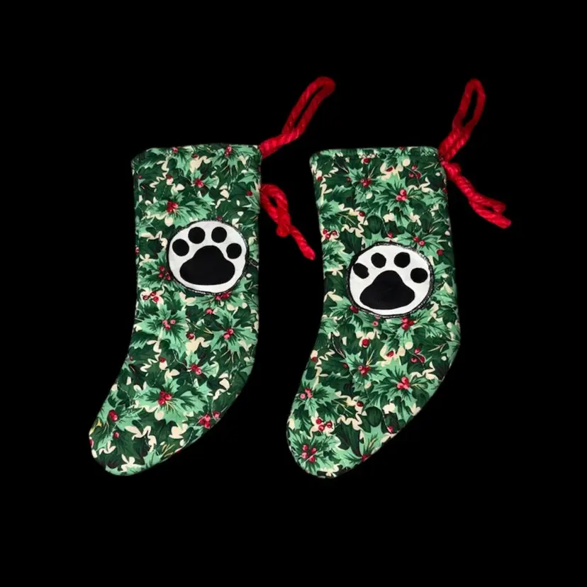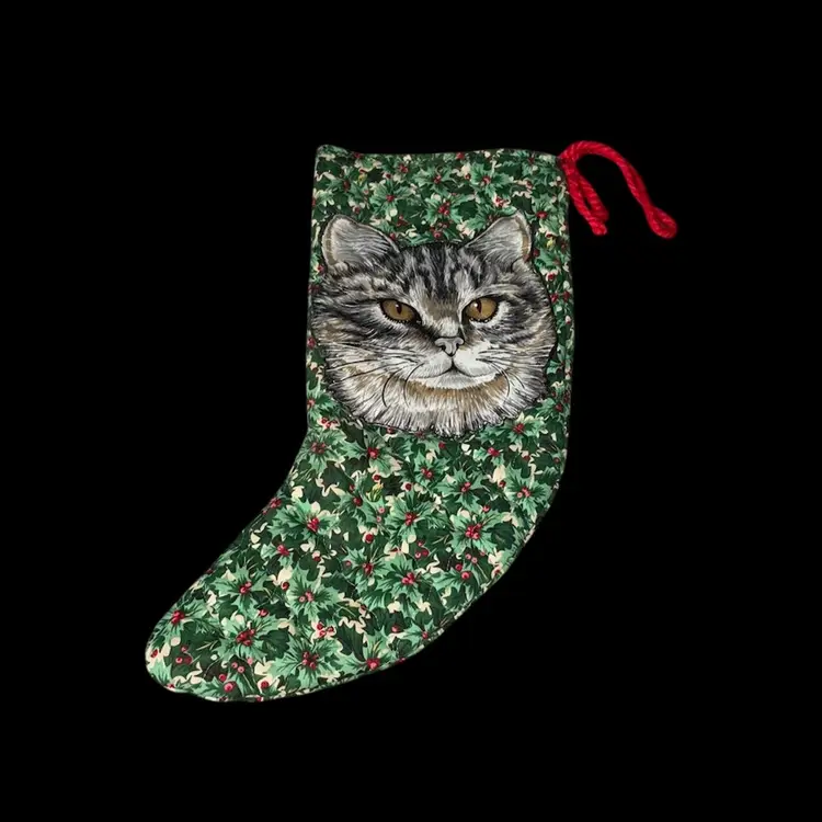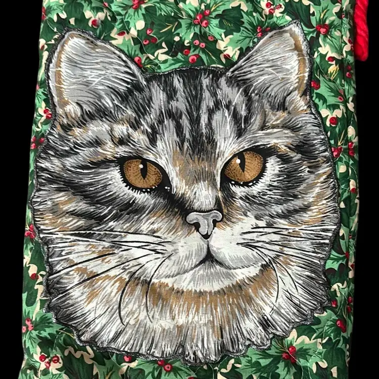 Have a Meowy Christmas with this vintage homemade quilted cat family stocking set Large cat stockings measure approximately 19" and kitty stockings 10". Chunky red yarn loop for hanging. No rips, tears or stains.