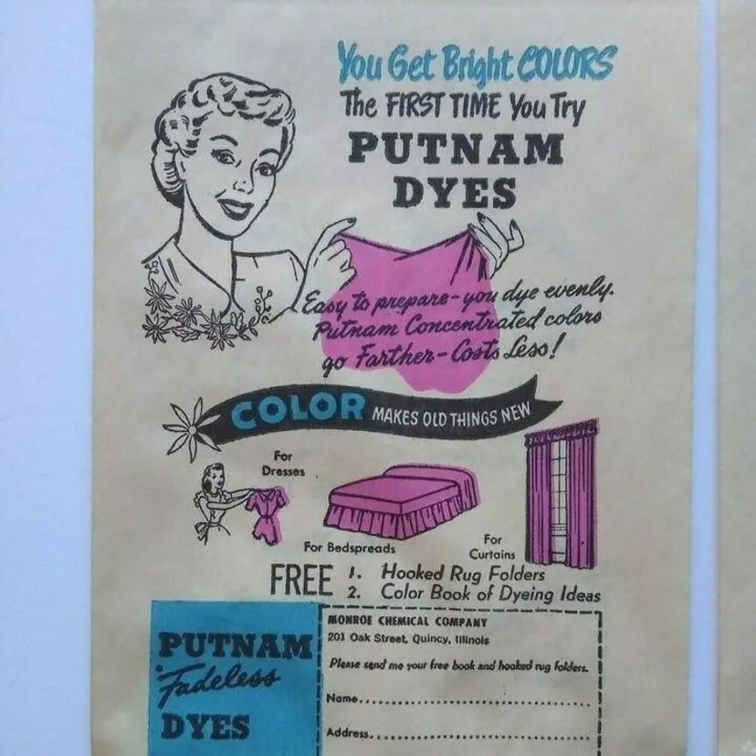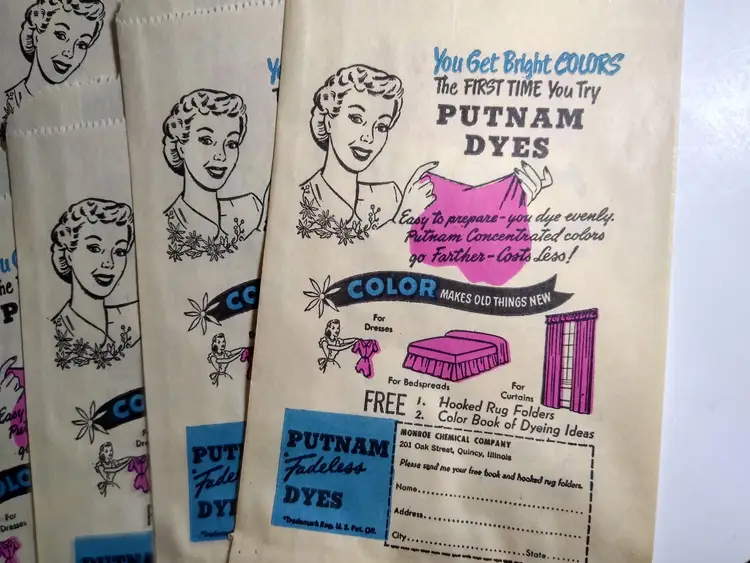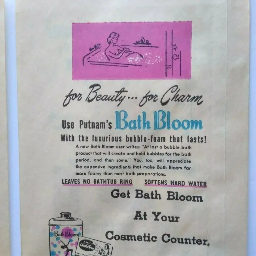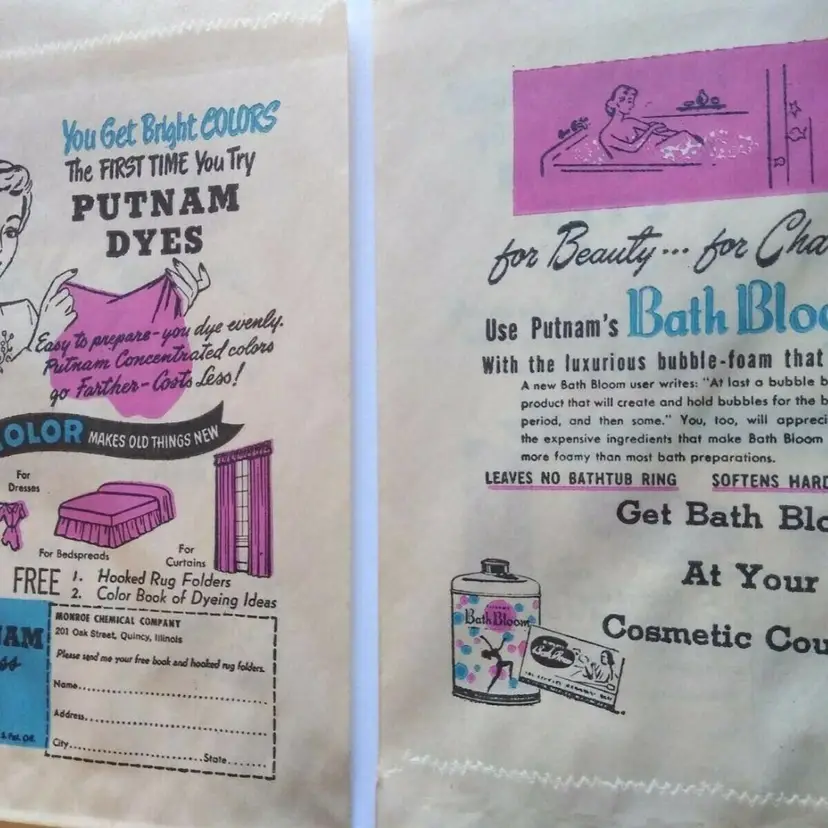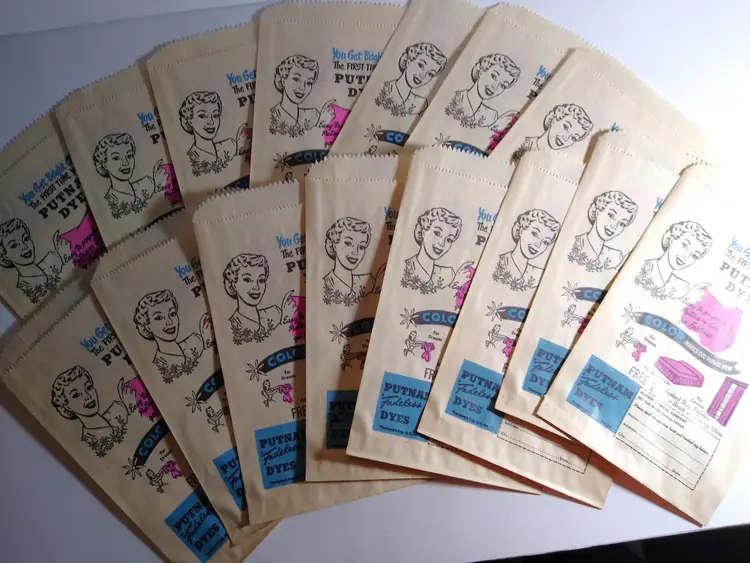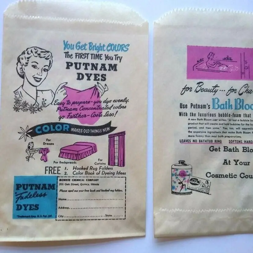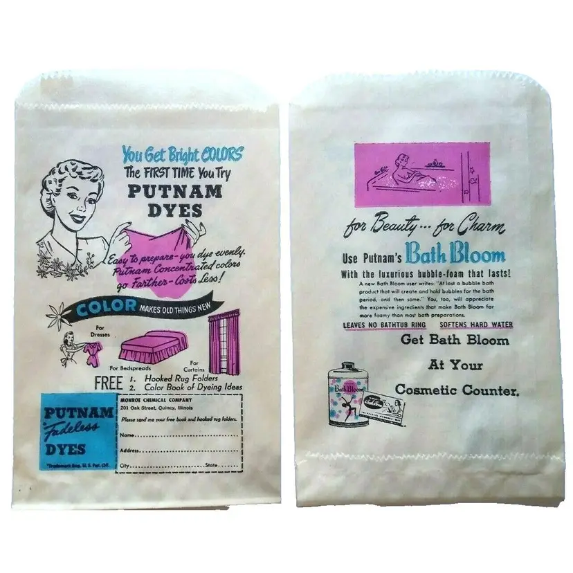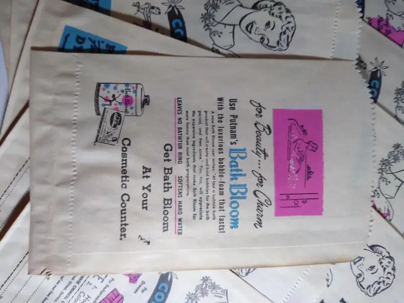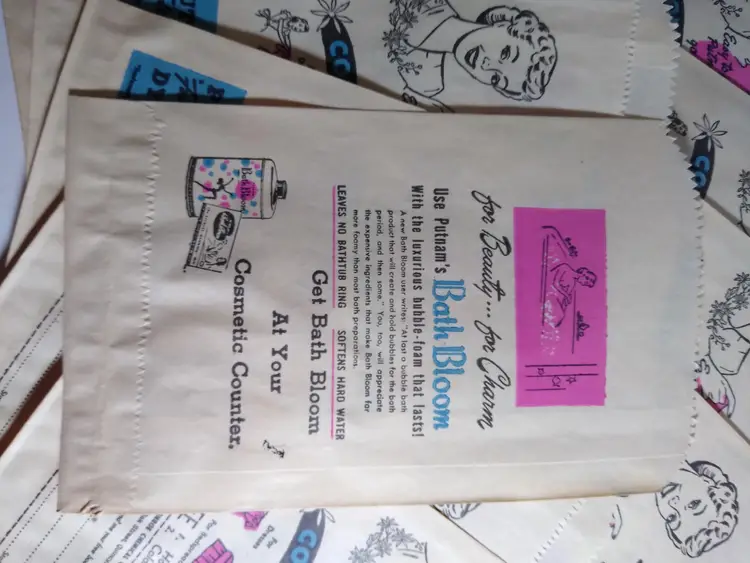 This lot includes (15) original paper bags from the 1940's advertising Putnam Dyes Bath Bloom cosmetics. These bags are a wonderful vintage collectible for those interested in ephemera and paper items from this time period. The bags proudly display the Putnam Dyes name and are from the United States. Size is 8" x 5" in excellent shape.