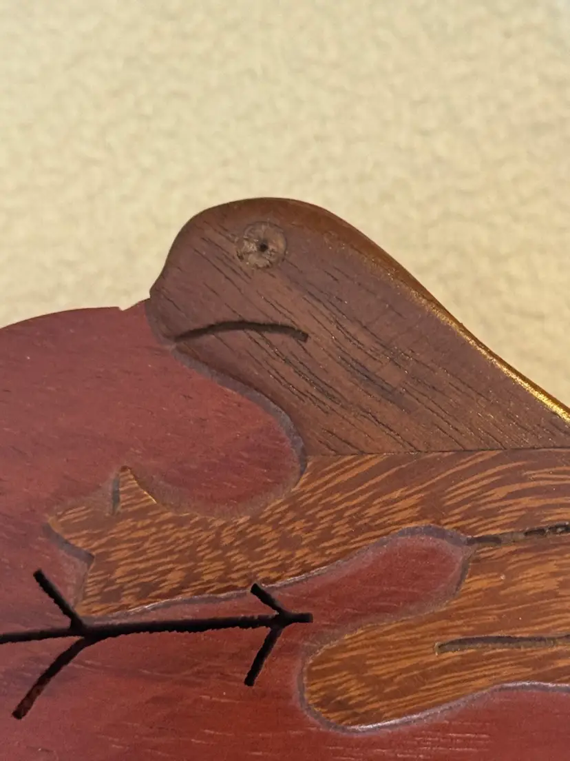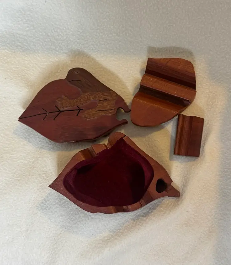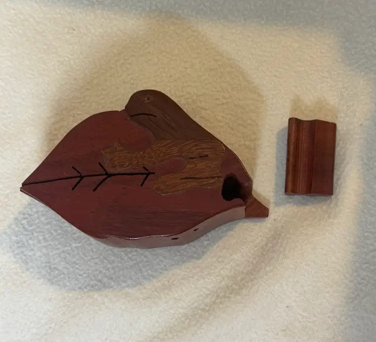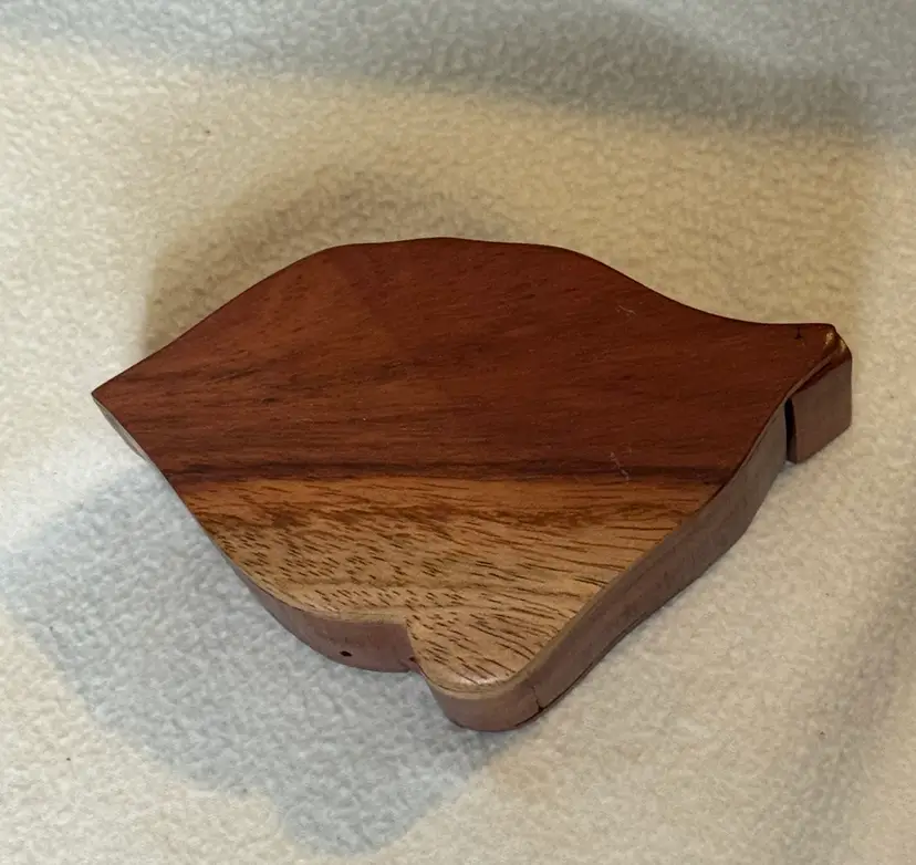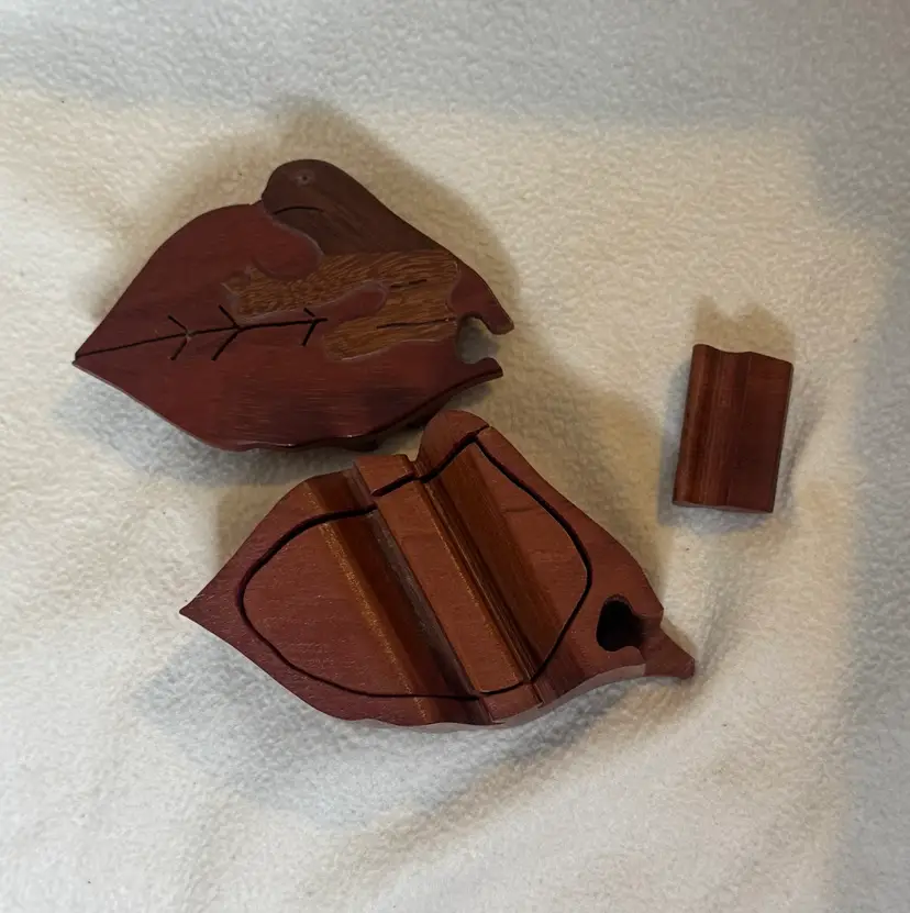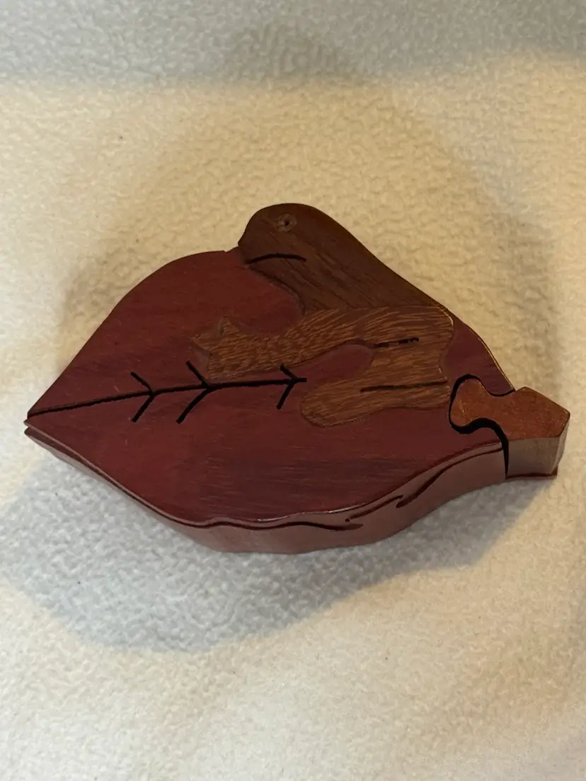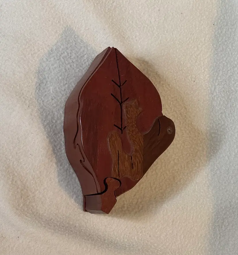 Hand carved wooden puzzle box shaped like a leaf with a sloth on top. It is made of four hardwood pieces that fit together. It can also be referred to as a secret box or trick box, which can only be opened by solving a puzzle. There is a slight flaw in this pre-owned puzzle box - the eye of the sloth is missing. However, this is the only noted flaw. 2” x 5.5” x 3.5”.