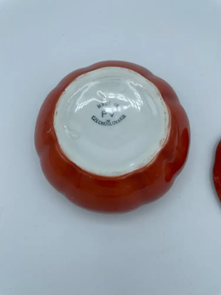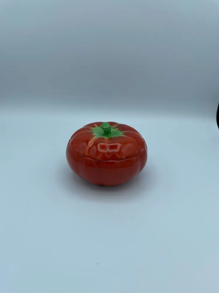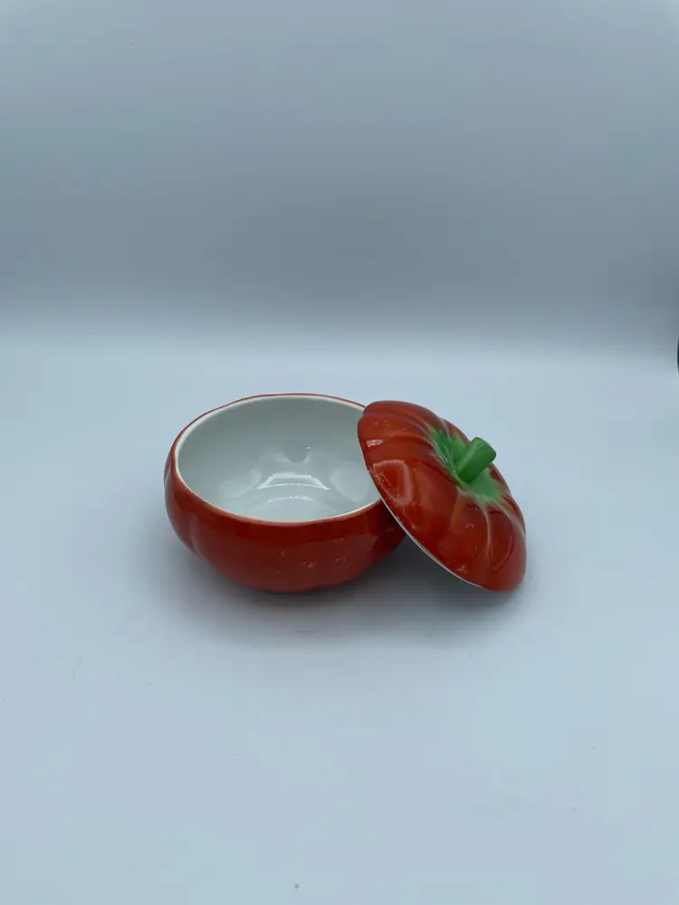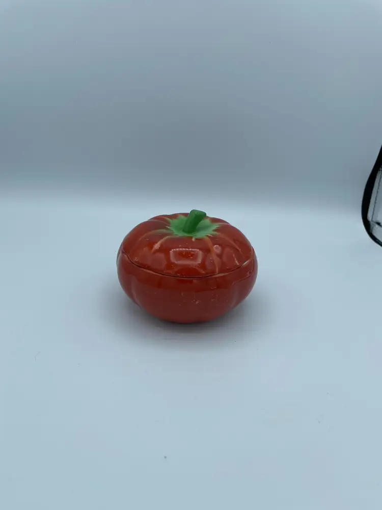 Vintage PV Czechoslovankia Tomato With Lid. Minor Paint Loss. Orange/Green. 2 3/4" H X 4 W.