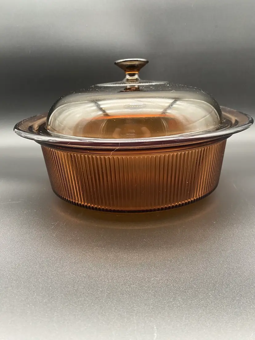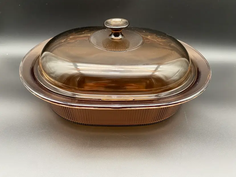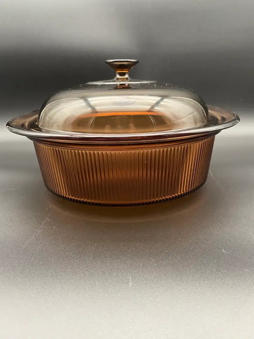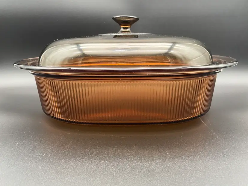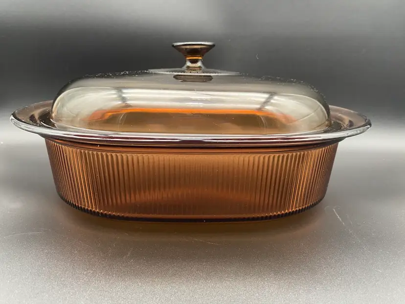 You are purchasing one Amber Glass 4 Quart Roaster w/ Lid by Pyrex and their Visionware line. Roaster Item #V-34-B and Lid Item #V-34-C. This Roaster is in excellent condition with minimal signs of use. No chips, cracks, scratched or staining.