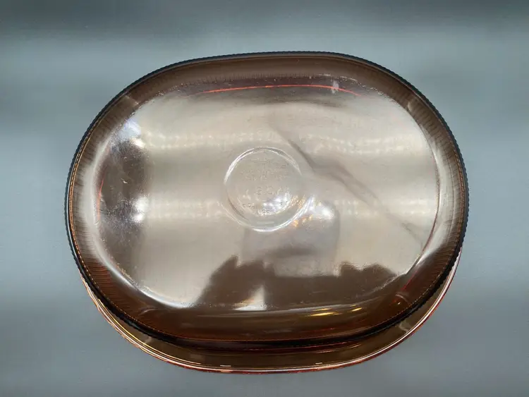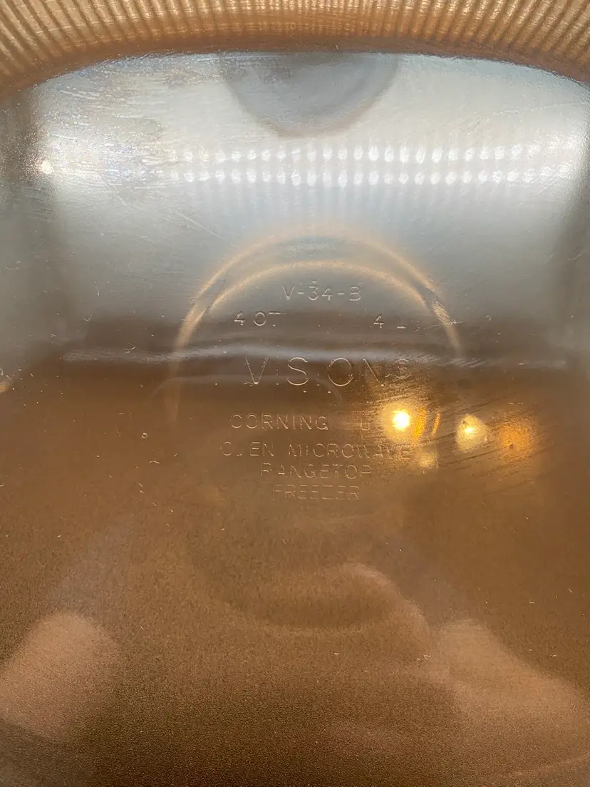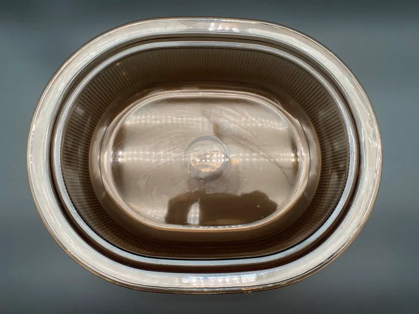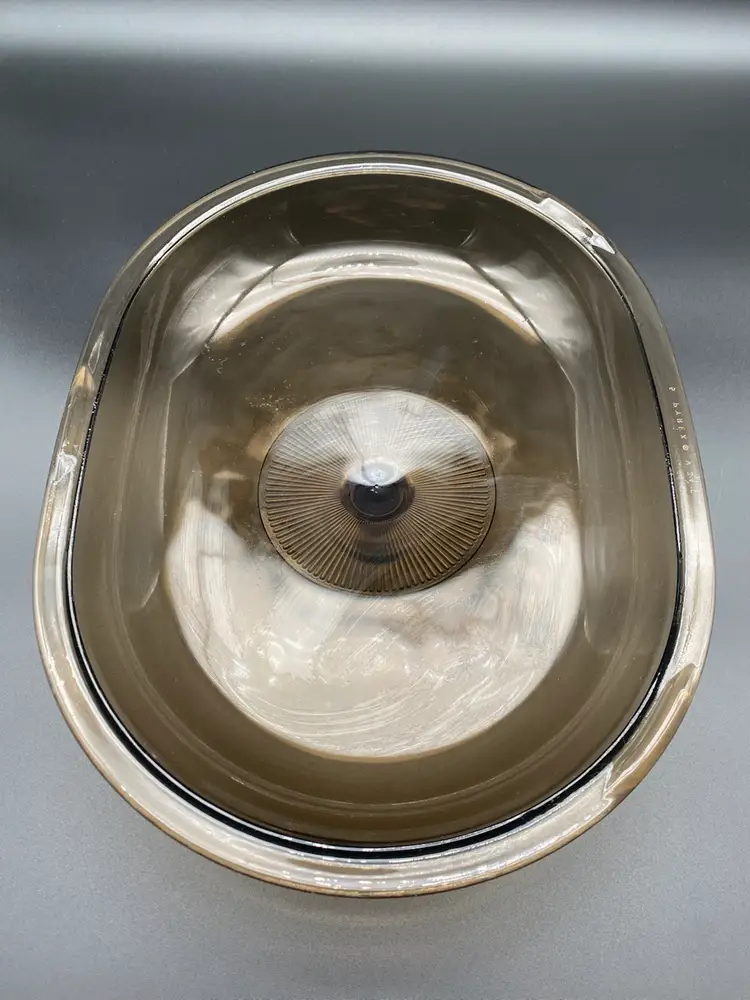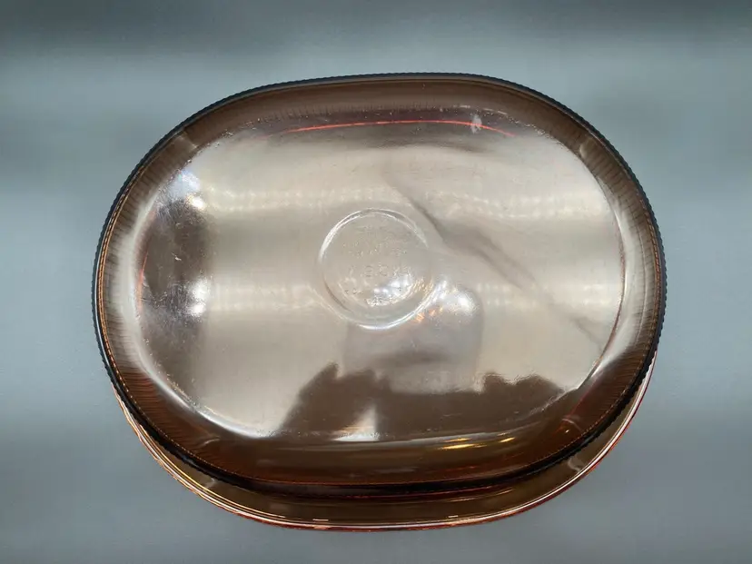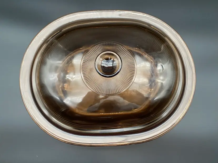 You are purchasing one Amber Glass 4 Quart Roaster w/ Lid by Pyrex and their Visionware line. Roaster Item #V-34-B and Lid Item #V-34-C. This Roaster is in excellent condition with minimal signs of use. No chips, cracks, scratched or staining.