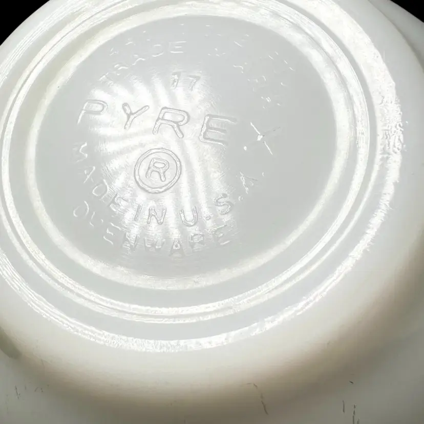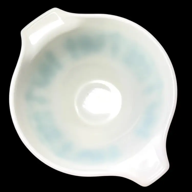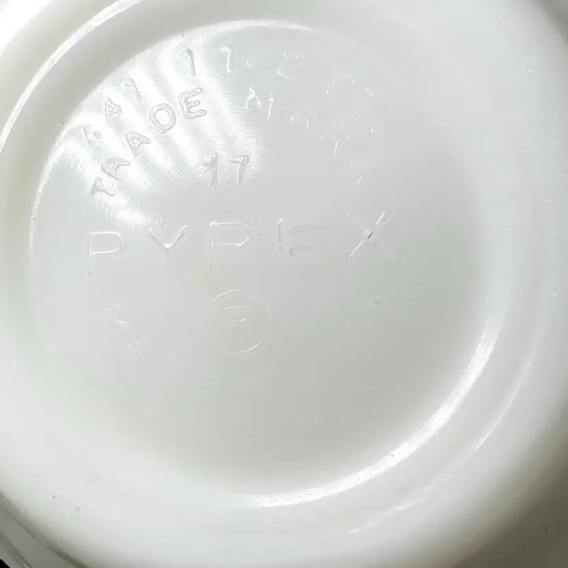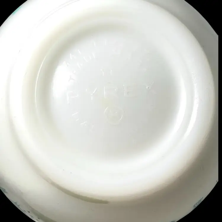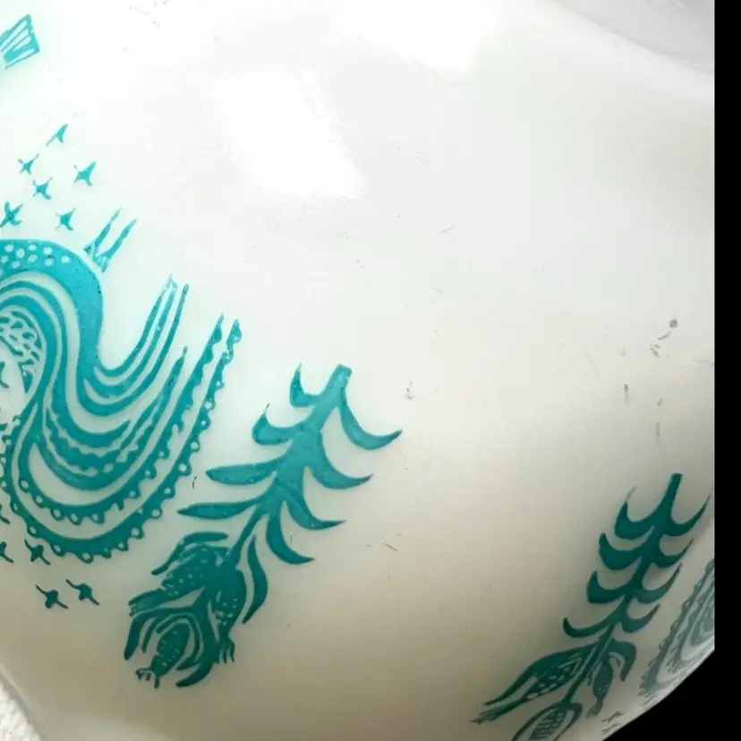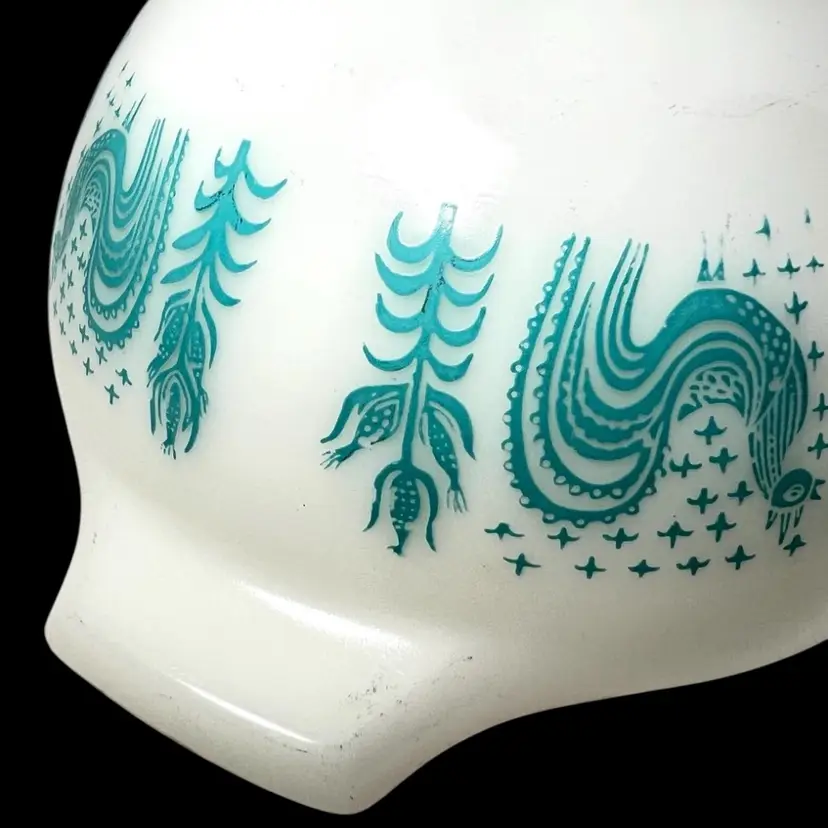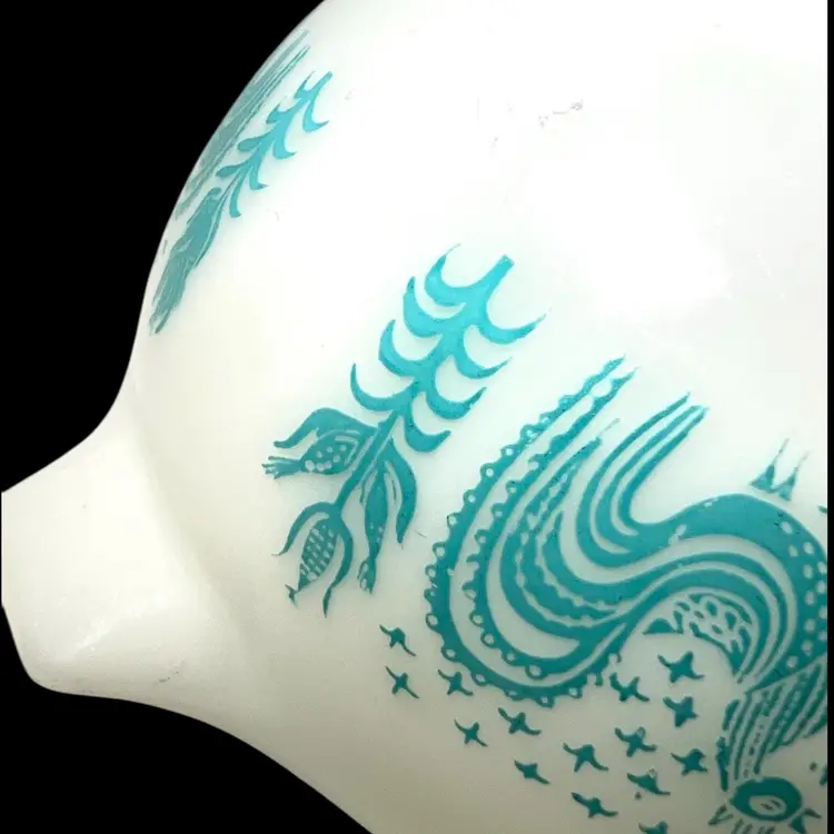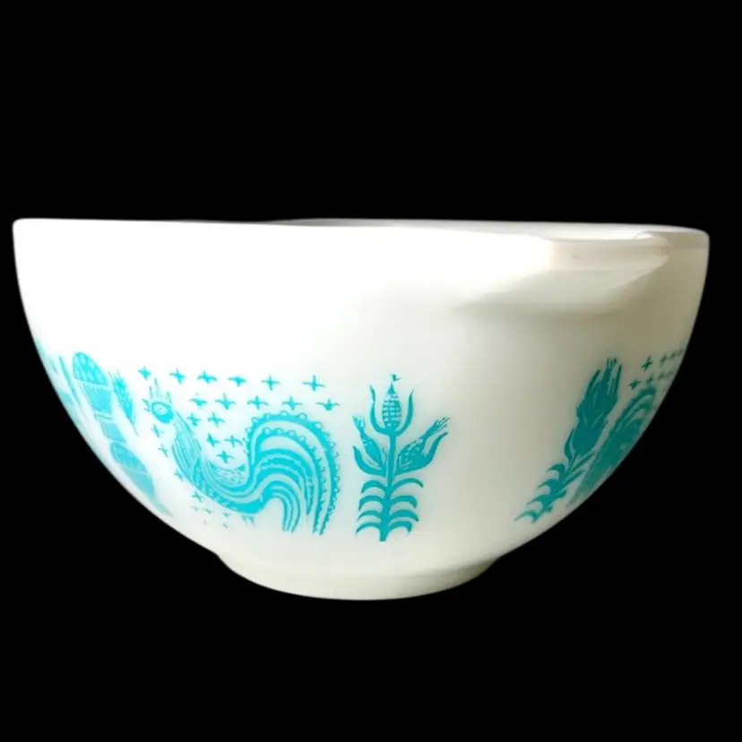 Vintage -1959s-60s. Pyrex Cinderella mixing bowl. It has the small handles or spouts on either side. “Amish Butterprint" design. White milk glass bowl with turquoise farm scene. Size #441, 1-1/2 pint the smallest bowl in the Cinderella nesting set. Marked on bottom with 441, 1 1/2 pt, Trade mark, 17, PYREX, R, Made in U.S.A., Ovenware. 7-1/2” handle-to-handle x 3-1/2” tall. Weighs over 1 pound. Condition: Shiny (no dishwasher damage). No chips/cracks. Pattern print beautifully intact and colorful. Vintage used condition with very minor utensil marks on interior and few marks on exterior- please see photos. It may have a slight brownish tinge of color on bottom interior.